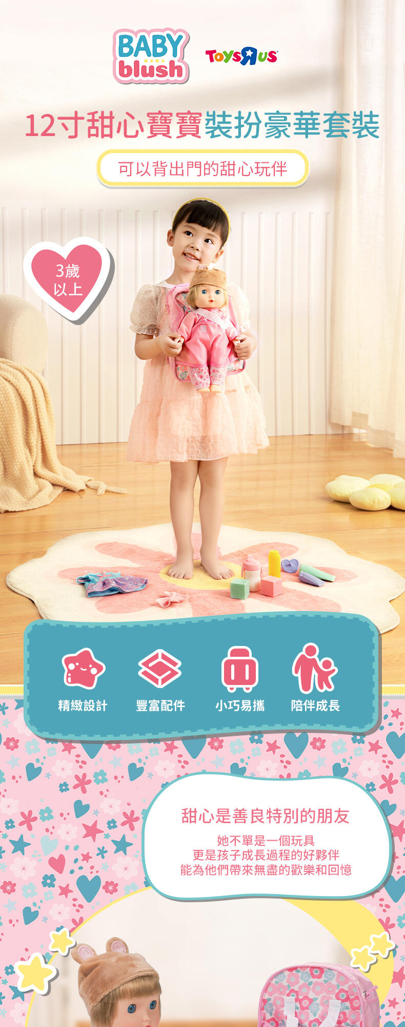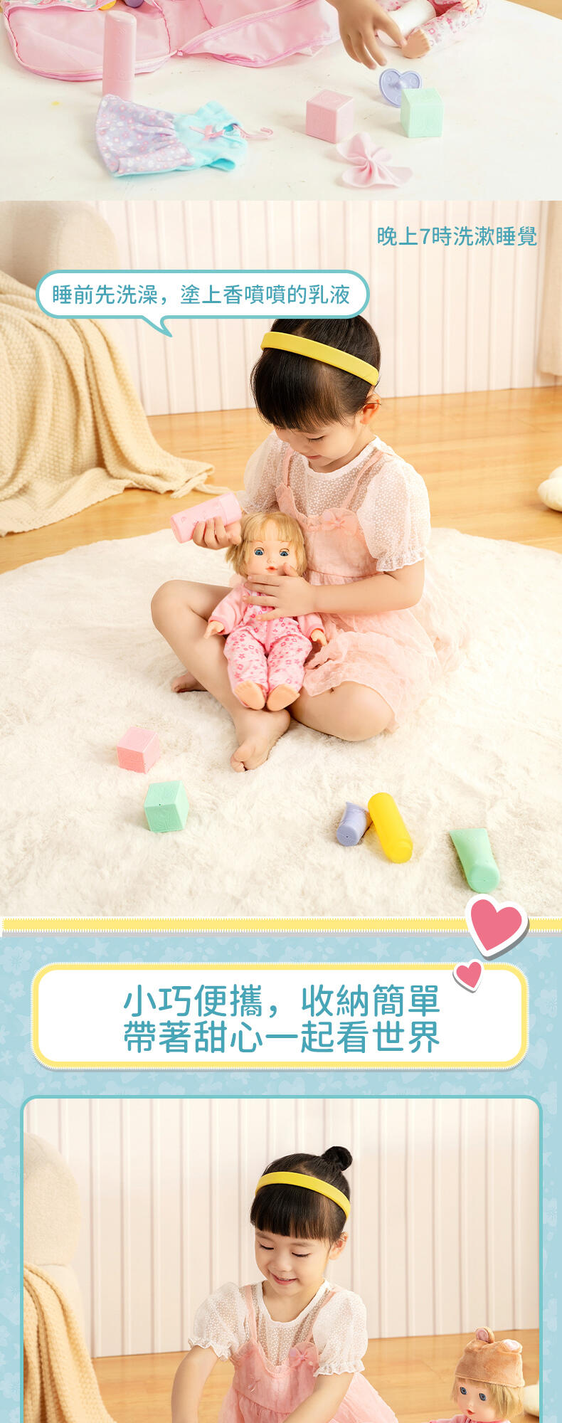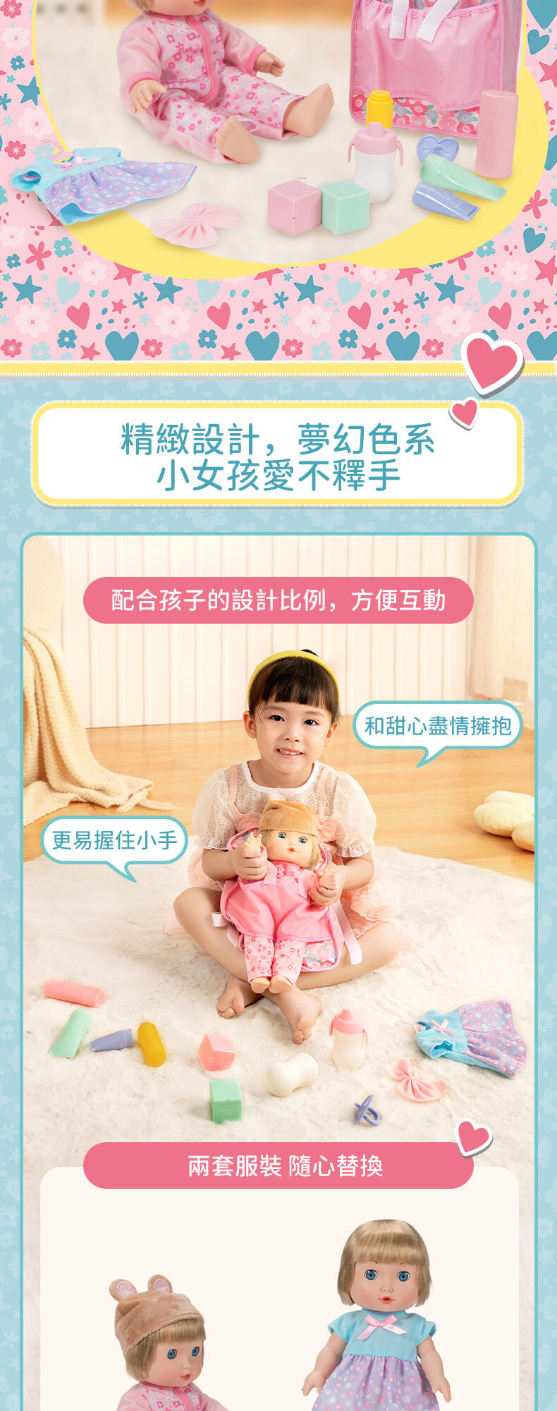 Lovely is a kind and special friend who you can nurture and cherish. This special play set has everything you need to take her out and about with you - extra clothes, milk bottles, sip cup, bath essentials and a special backpack to carry everything. Lovely is thoughtfully proportioned for little hands, and kids will love dressing her, hugging her and taking her on new adventures!