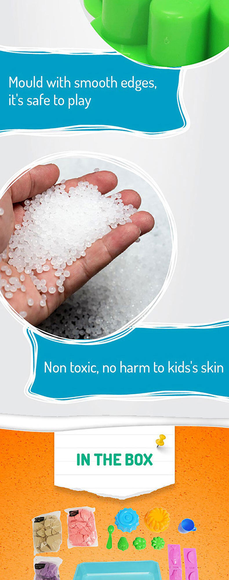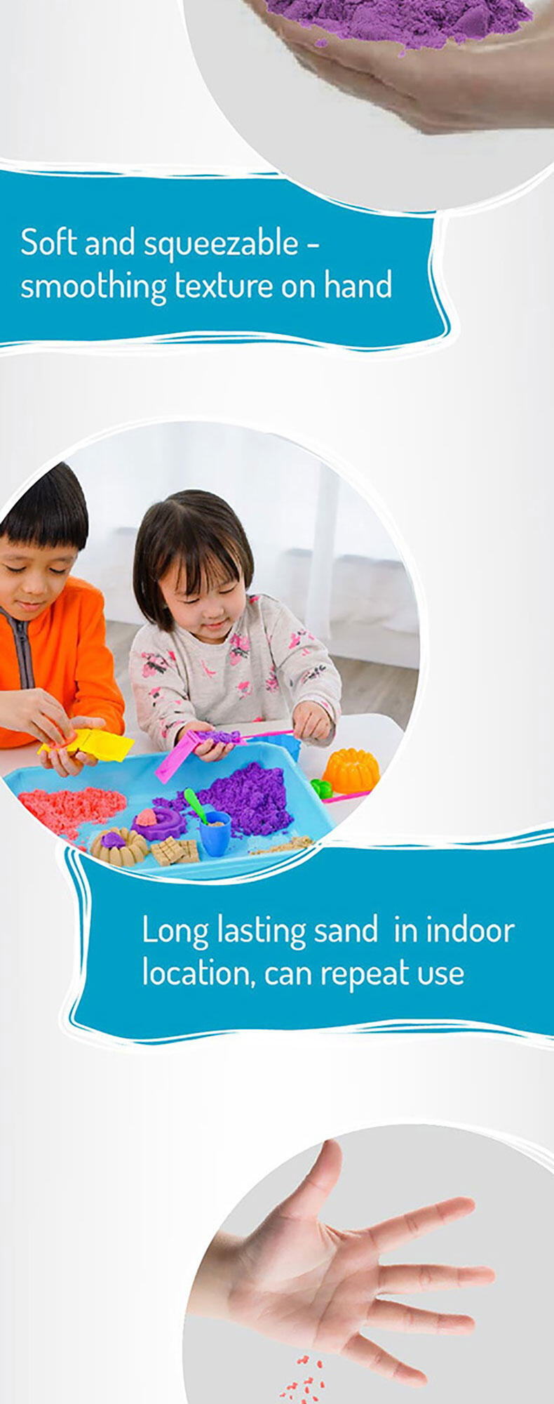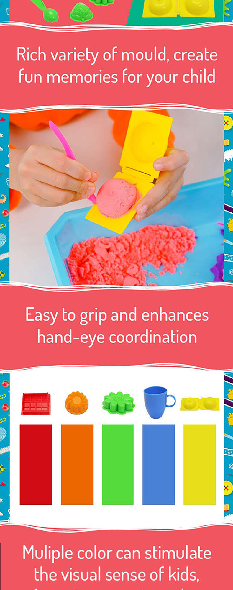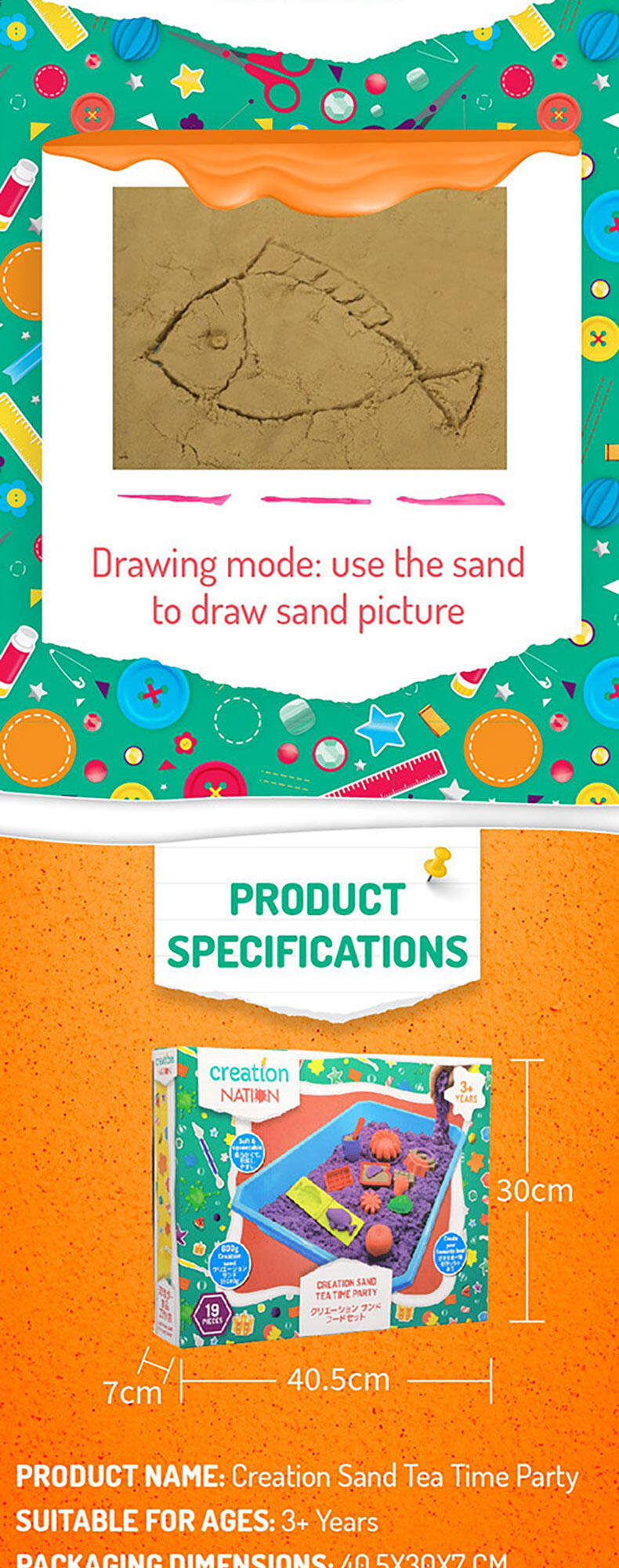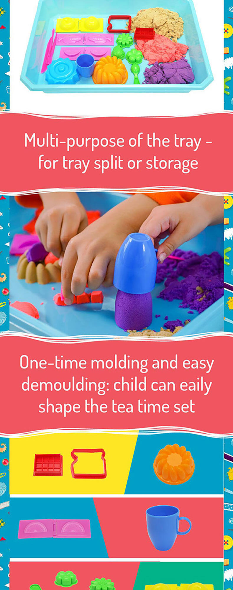 The next star junior chef is giving their magic touch to the malleable Creation Sand while chatting with their diners. They start the feast with the moulded red bread, followed by the modelled purple fish. Last but not least is the non-sticky pudding with a brown strawberry! Bon appetit!
