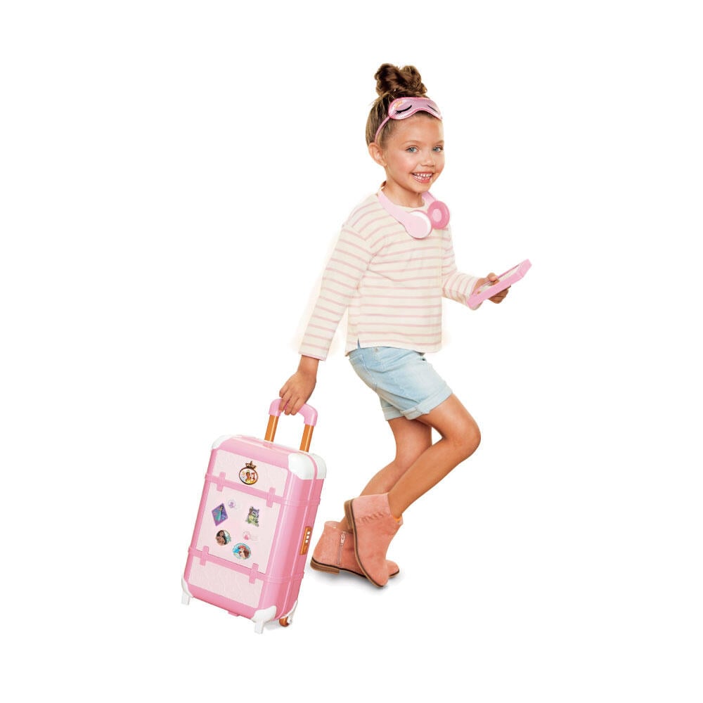 - 14 Piece Toy suitcase includes Play Headphones, Play Tablet, “Charging” Cord, 3 Double-Sided Tablet Cards, Eye Mask, Passport, 2 Sticker Sheets (one to decorate outer-case and one to use inside Passport), Toothbrush w/ Case, Play Toothpaste and Hand Sanitizer