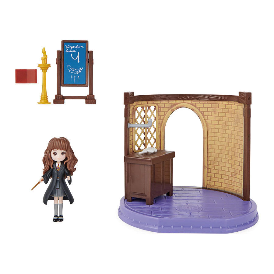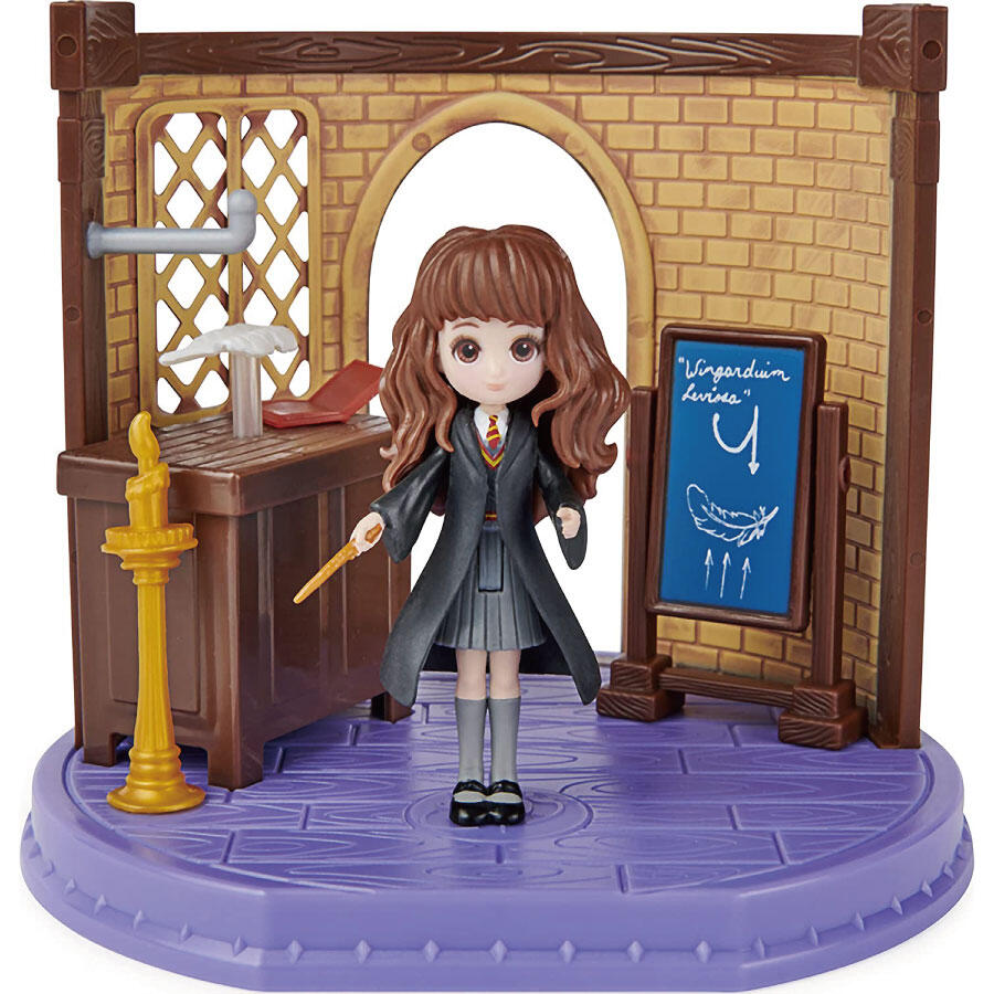 Join Hermione while pretending to practice and perfect spells in the Wizarding World Magical Minis Charms Classroom! Featuring an exclusive 3-inch Hermione Granger doll and three themed accessories, young witches, wizards, and Muggles can recreate their favorite Harry Potter scenes with this fun playset. Pose Hermione and move her arm to use her wand, then make the feather float by moving Hermione over the activation spot. Wingardium Leviosa! The feather lifts off the desk and magically levitates! Add to your storytelling with the chalk board, spell book and candle stick accessories.