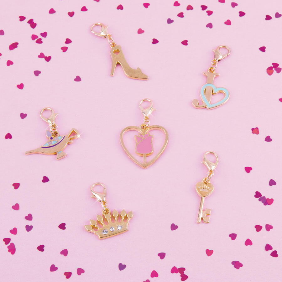 Two favorite brands come together to form one awesome kit in the Disney Princess Juicy Couture Hearts of Fashion. This DIY set invites designers to make 6 bracelets featuring images from fashion label Juicy Couture along with Belle, Cinderella, and Jasmine. Fans can mix and match the styles to make unique mash-up creations. This kit comes with 3 Disney Princess charms. There’s a glass slipper for Cinderella, a rose for Belle, and a magic lamp for Jasmine. There’s 3 Juicy Couture charms: a key, a crown, and a “J” with a heart. Gold beads, colorful beads, and floral designs are perfect for fans of the Disney Princess and Juicy Couture The kit comes complete with a special booklet featuring the Disney Princesses and history of Juicy Couture along with instructions.