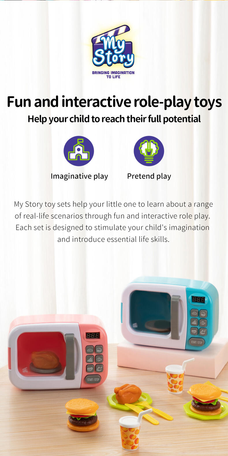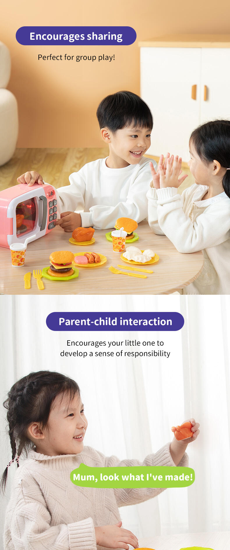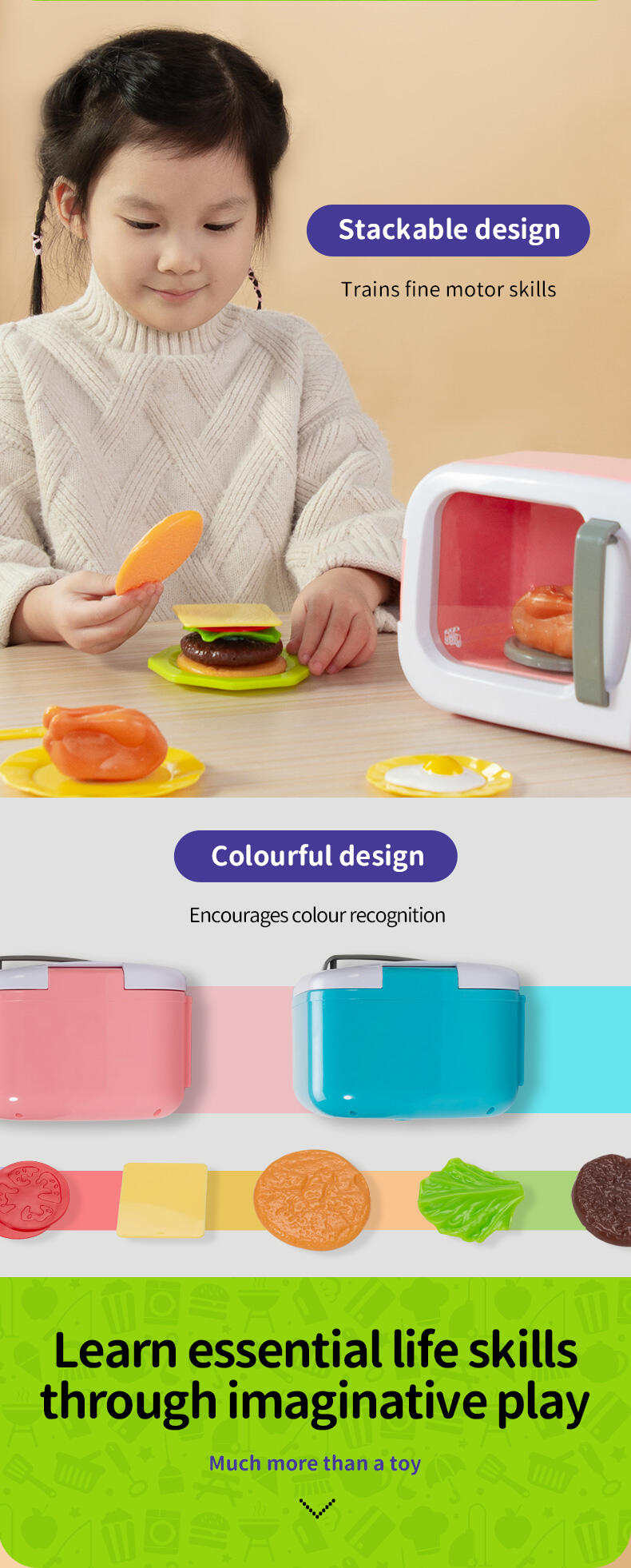 The Mini Microwave has realistic lights and sounds that work just like the real thing! There are buttons to press, a cooking plate that spins, and a light that activates when the microwave is in use. Accessories like food and utensils ensure that the play experience feels just like the real thing as kids cook and prep delicious meals for friends and family. The interactive and authentic functionalities of this toy creates a positive and open experience that ensure little ones build confidence through play.