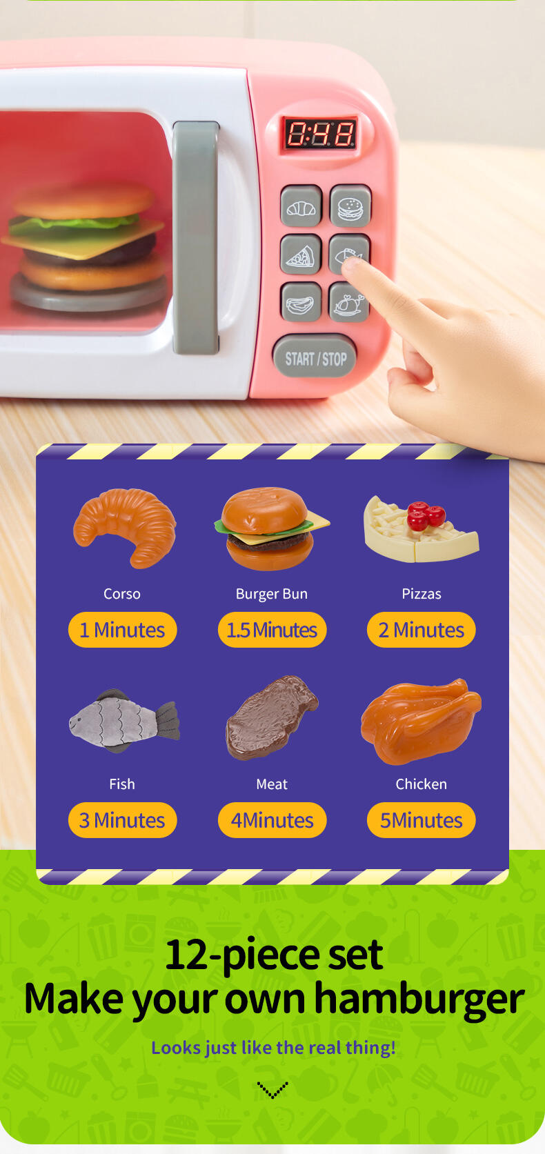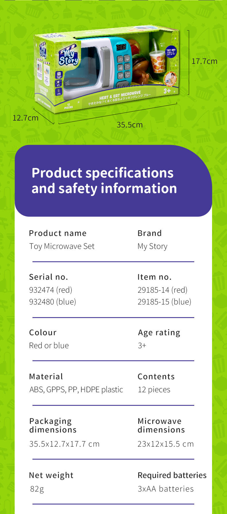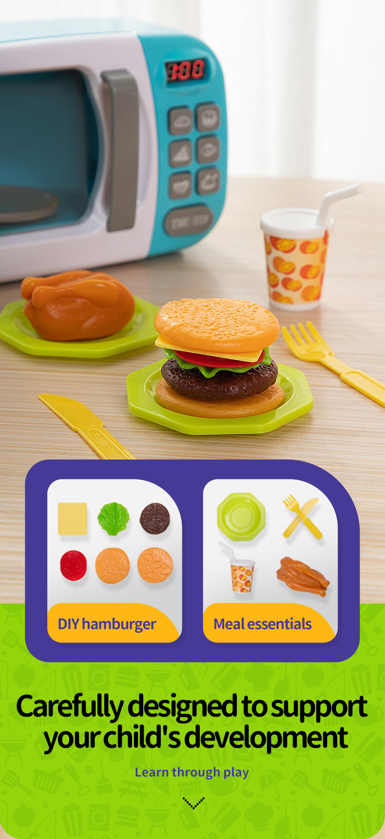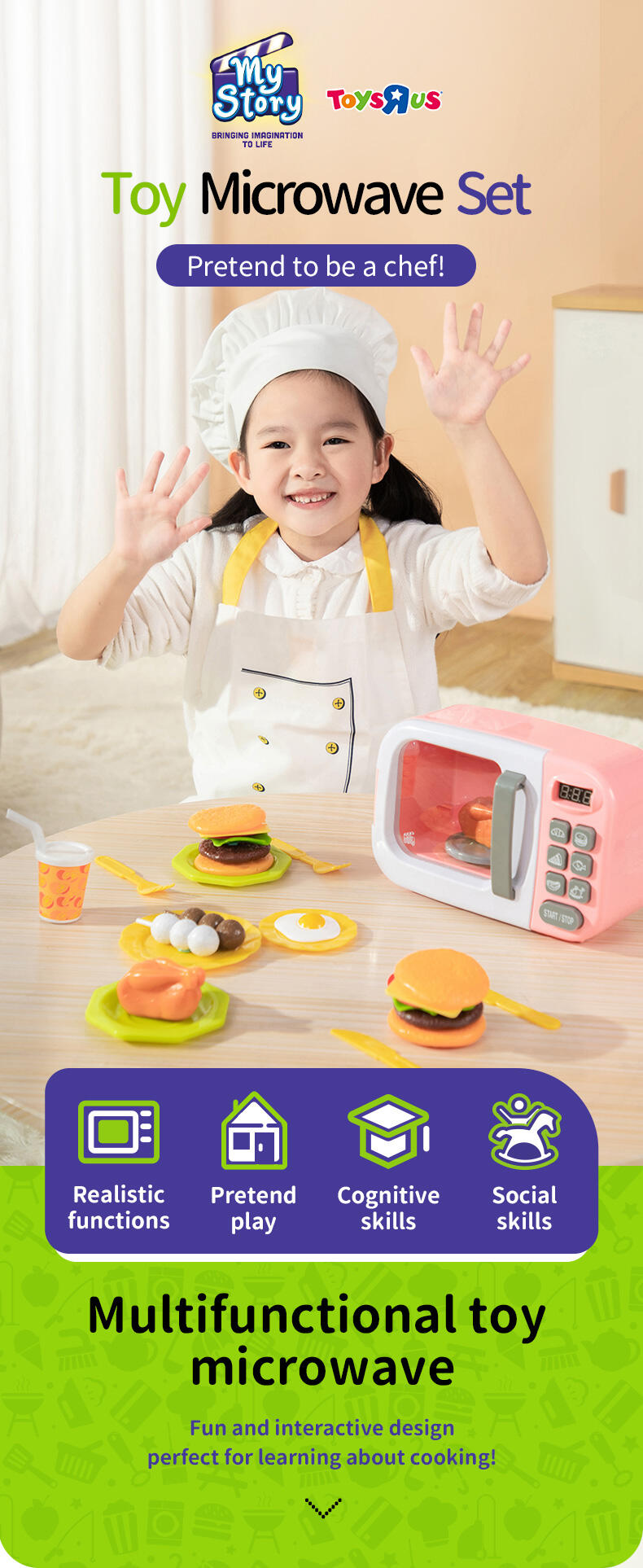 • Interactive microwave with realistic lights, sounds & movement