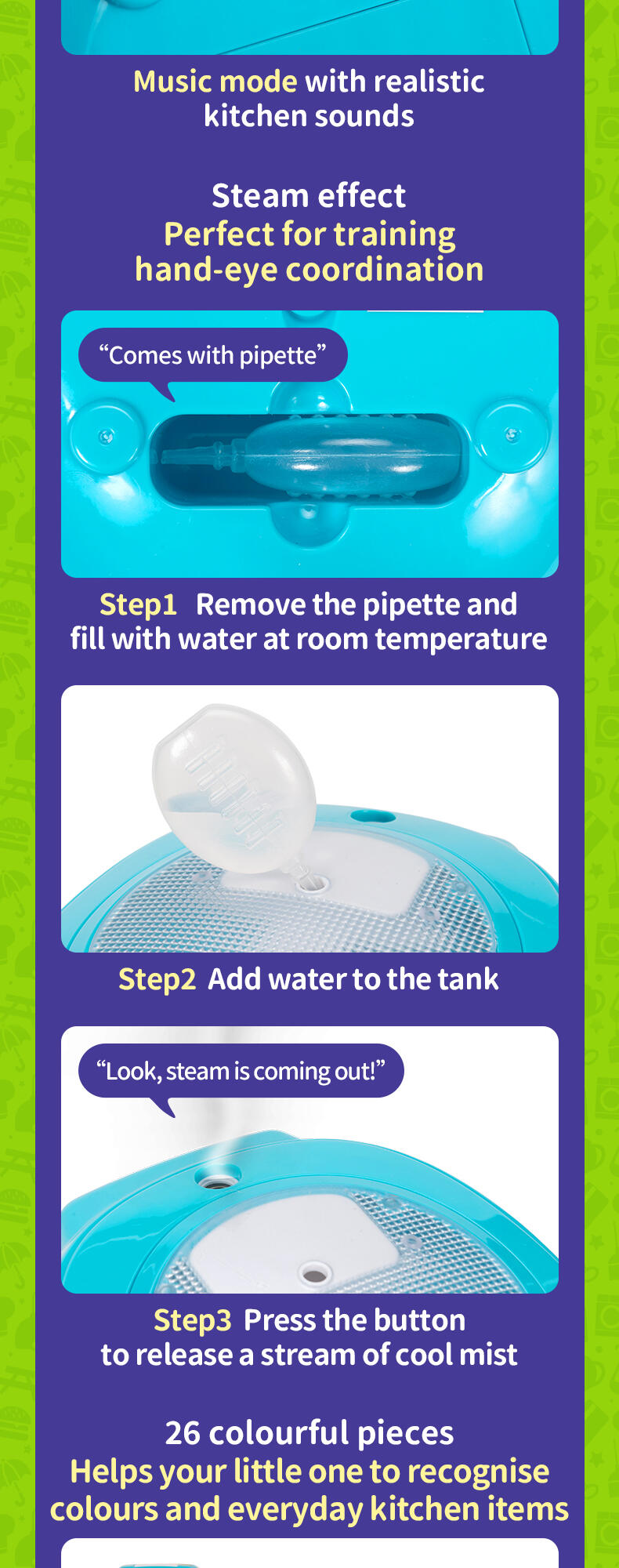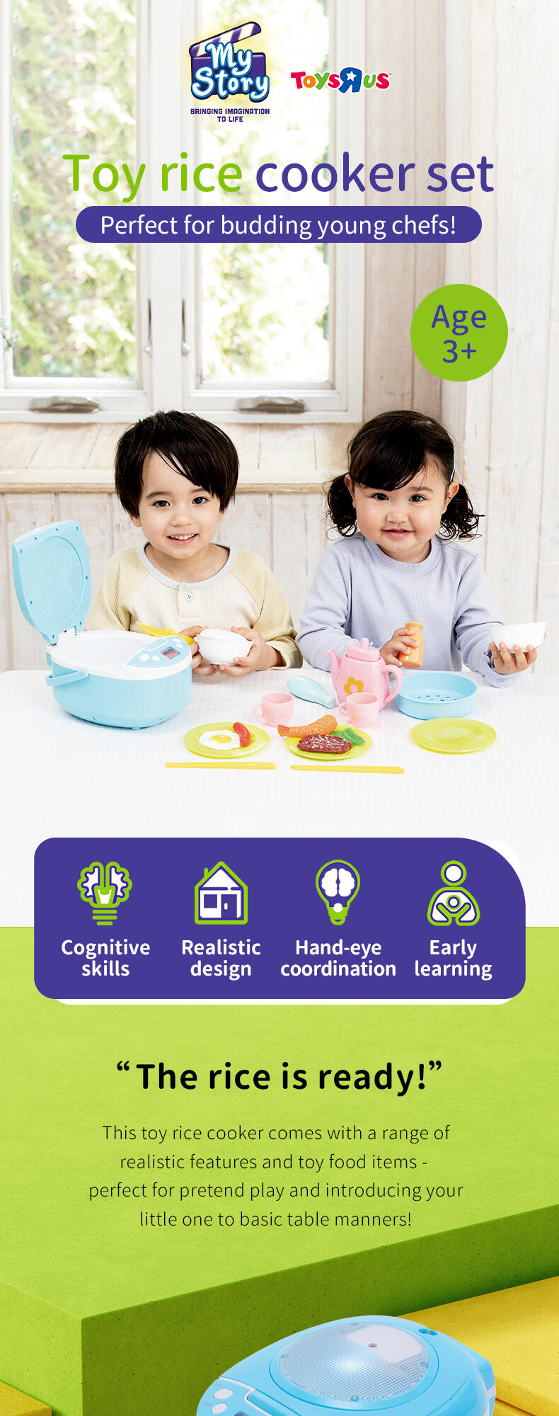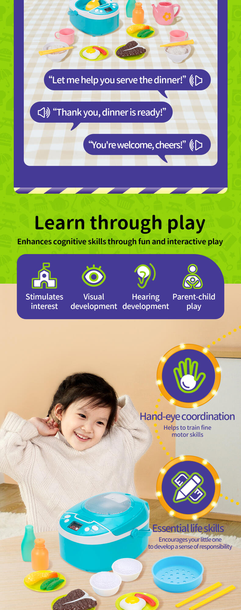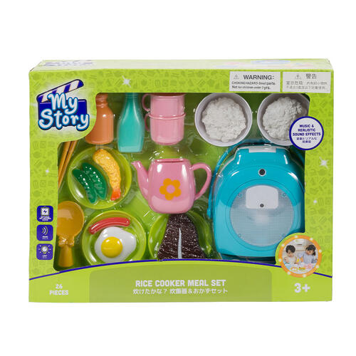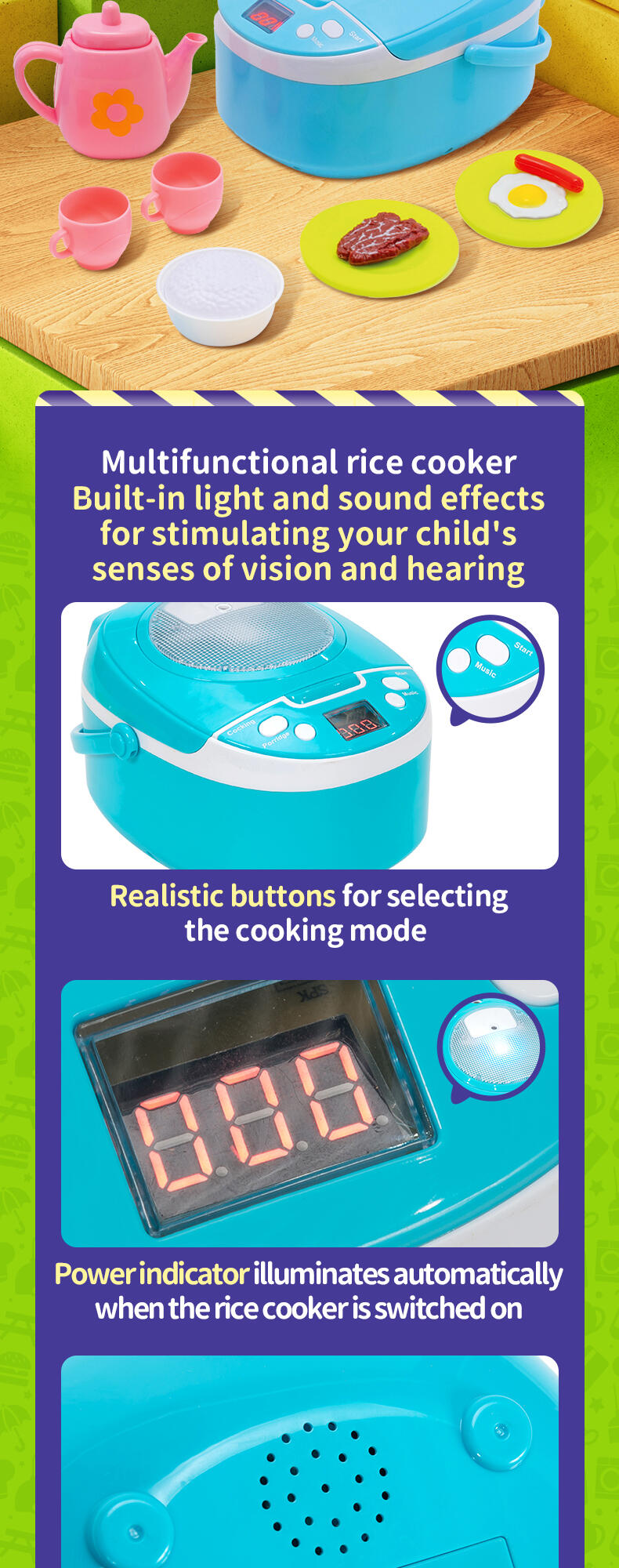 The realistic functions of this mini rice cooker will delight little chefs who have the chance to build their own stories and play scenarios, supported by the authentic look and feel of this set. The rice cooker has steam and sound effects, just like the real thing, and the set also includes utensils and ingredients to create delicious meals. Kids can develop their creative abilities, build a positive relationship with a variety of nutritional foods, and immerse themselves in practical and life-like scenarios.