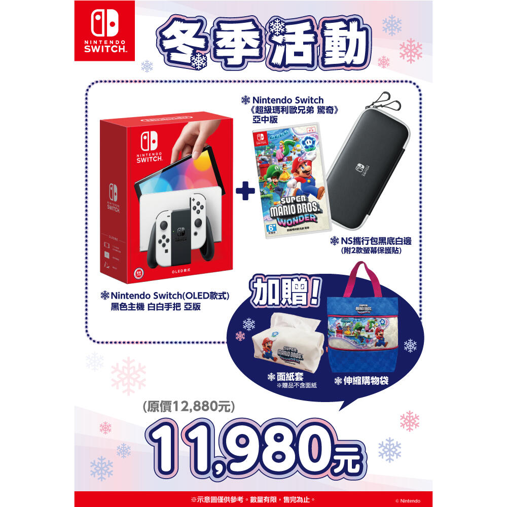Nintendo Switch(OLED款式)黑色主機 白白手把 亞版+收納包附2款螢幕保護貼+超級瑪利歐兄弟 驚奇 亞中版附贈品