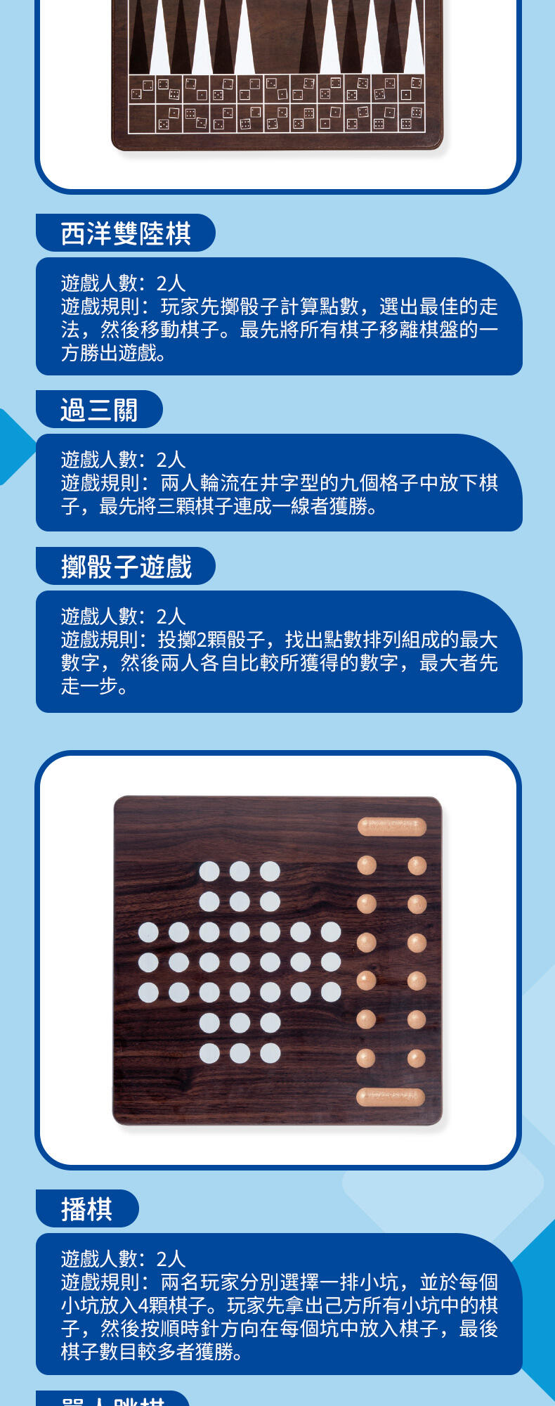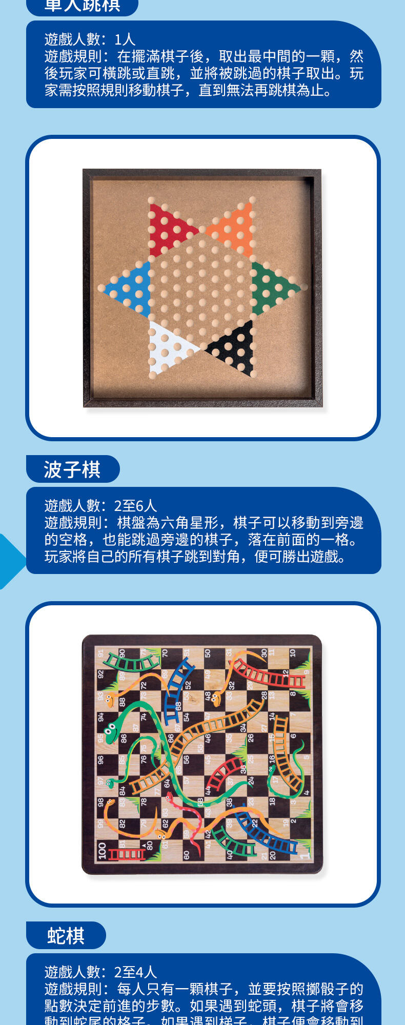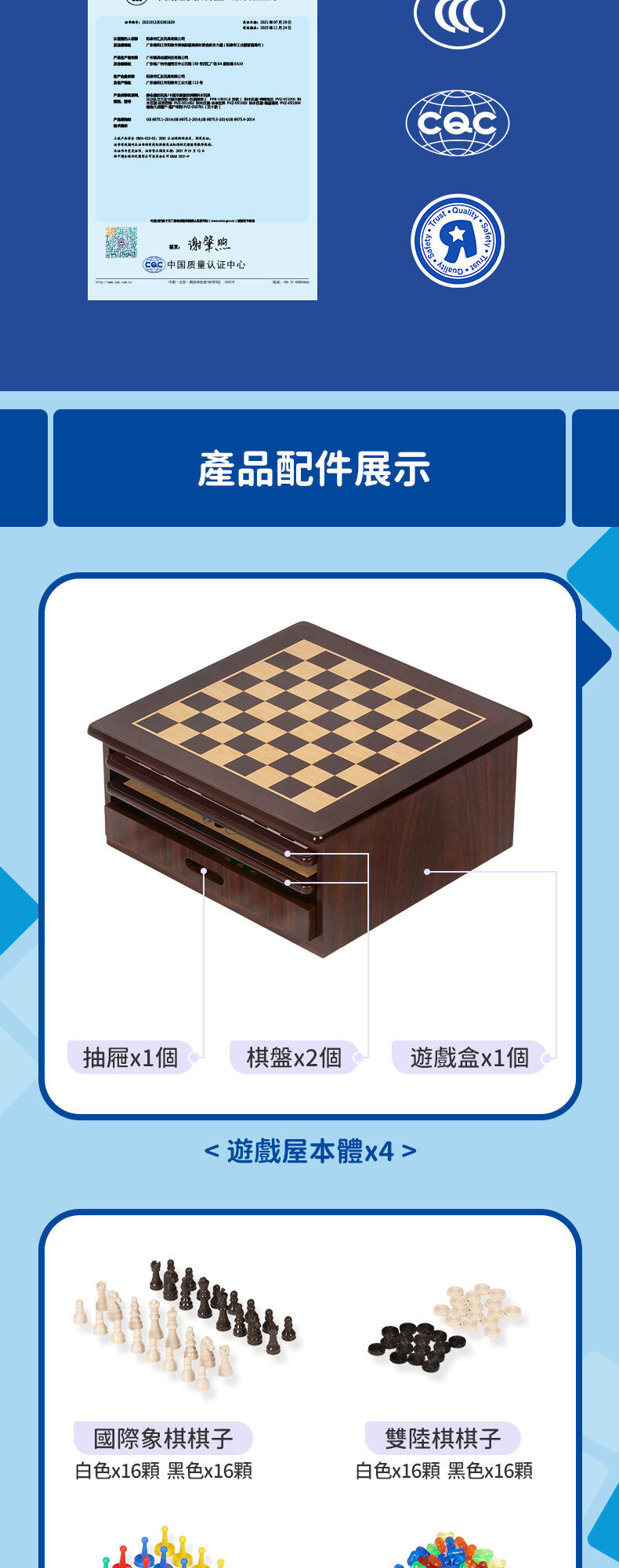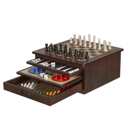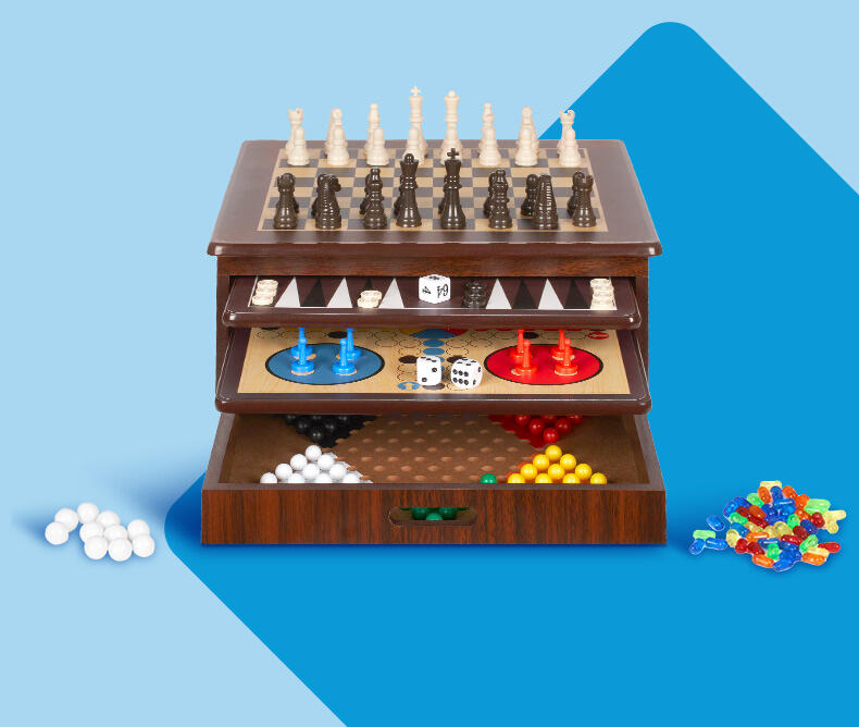 - 80 playing pieces (32 chess pieces,32 backgammon counters, 16 ludo figures)
