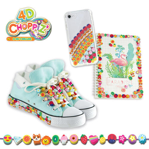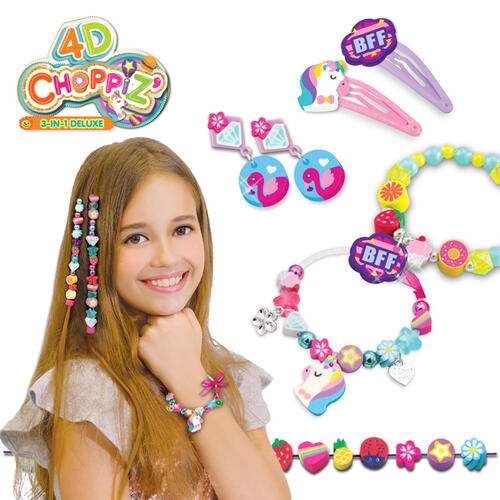 Choose It! Chop It! Punch It! With This 4D 3-in-1 Deluxe Jewellery Making Set. Easy To Make Jewellery And Hair Accessories. The Decorative Accesories Start As Eraser Sticks And Once You Choppiz' Can Become Anything From Hair Clips To Bracelets! Beads, Charms And Stickers In Popular Designs Like Donuts, Unicorns, Cheeseburgers, Emoji's And More! Make up To More Than 240 Charms With Your Choppiz'!