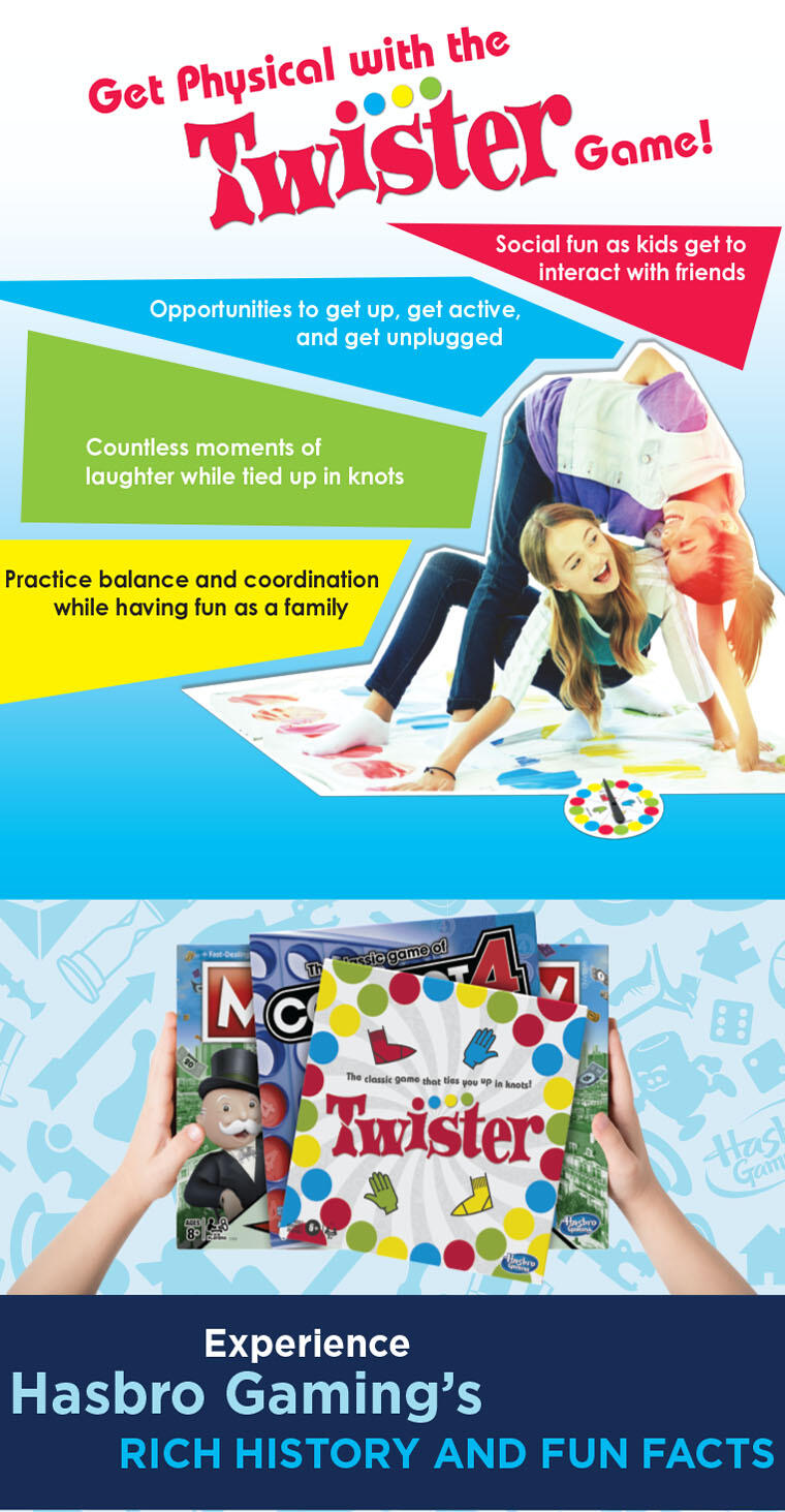 Twister - The game that ties you up in knots! A fun family game that requires balance and rubber limbs!