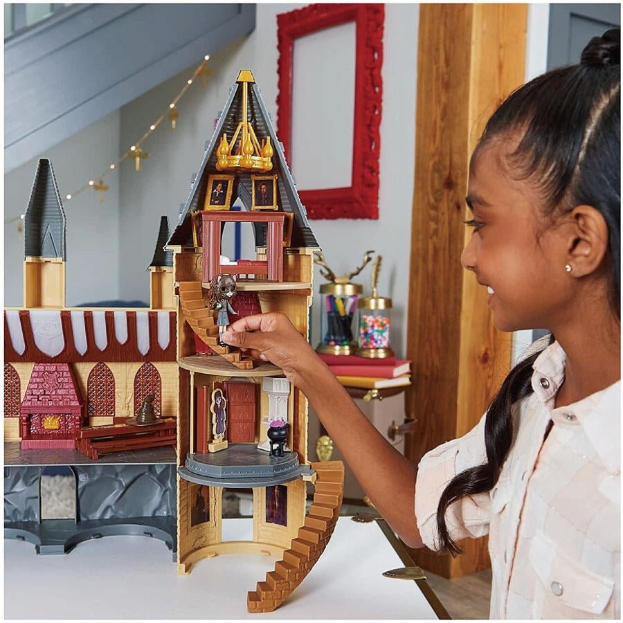 Recreate your favorite Harry Potter scenes and play out your own spellbinding adventures with the Wizarding World Magical Minis Hogwarts Castle! This amazing 2-foot-tall playset is packed with magical features to discover, including an exclusive 3-inch Hermione Granger doll, 12 accessories, Moaning Myrtle’s Bathroom, enchanting lights, and sounds! With multiple places to play, there’s so much to explore in Hogwarts with Hermione and the collectible Magical Minis Harry Potter toys (each sold separately). The Great Hall is the perfect spot to begin your storytelling. Hermione can light up the fireplace or the Great Hall’s ceiling lights when she stands on the activation spot! The ceiling can also light up into each of the four Hogwarts House colors and each House song plays. Play out stories from the Harry Potter movies using the castle’s themed accessories. Pose and sit Hermione at the Great Hall dining table; place the Sorting Hat on your doll; move around the framed portraits, spin the Dormitory’s chandelier and more. Move the staircase and check out Moaning Myrtle’s Bathroom: Hermione can brew some Polyjuice Potion in the cauldron and wear the cat mask to recreate the famous scene. Get ready for a pop-open surprise – it’s Moaning Myrtle! For more ways to expand your Magical Minis small dolls world, there’s room in Hogwarts Castle to connect the Charms and Potions Classroom Playsets and you can connect the Care of Magical Creatures Playset to the outside (each sold separately)! Collect and connect all of the Magical Minis dolls and playsets to build your own Wizarding World! With so many incredible details and activations, this castle toy will inspire your imagination through exciting pretend play. The Wizarding World Magical Minis Hogwarts Castle is the ultimate gift for kids and Harry Potter fans. Requires 3 AAA batteries (not included). Bring home the Wizarding World Magical Minis Hogwarts Castle and experience the magic of Harry Potter!MAGICAL MINIS HOGWARTS CASTLE: This almost 2ft. tall castle has lights, sounds and amazing details. Experience the ultimate settings for Wizarding World adventures in the Great Hall, Gryffindor common room, Moaning Myrtle’s Bathroom and more!