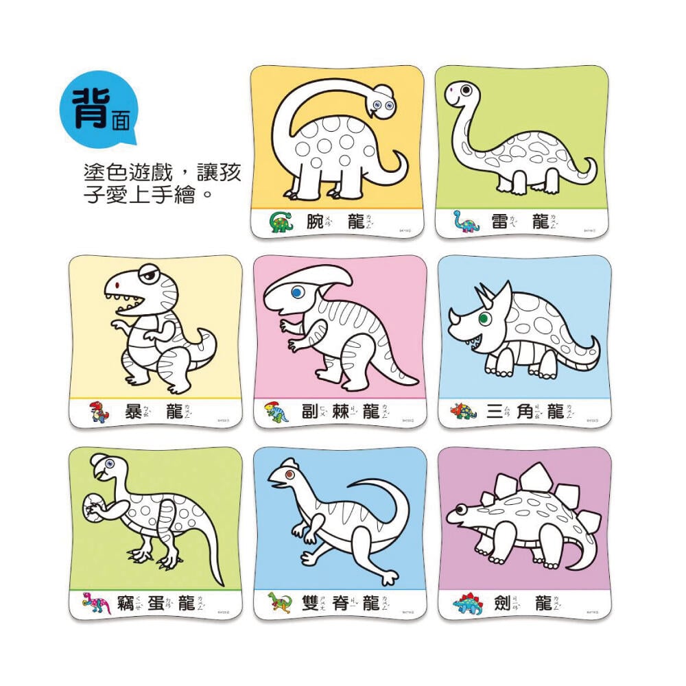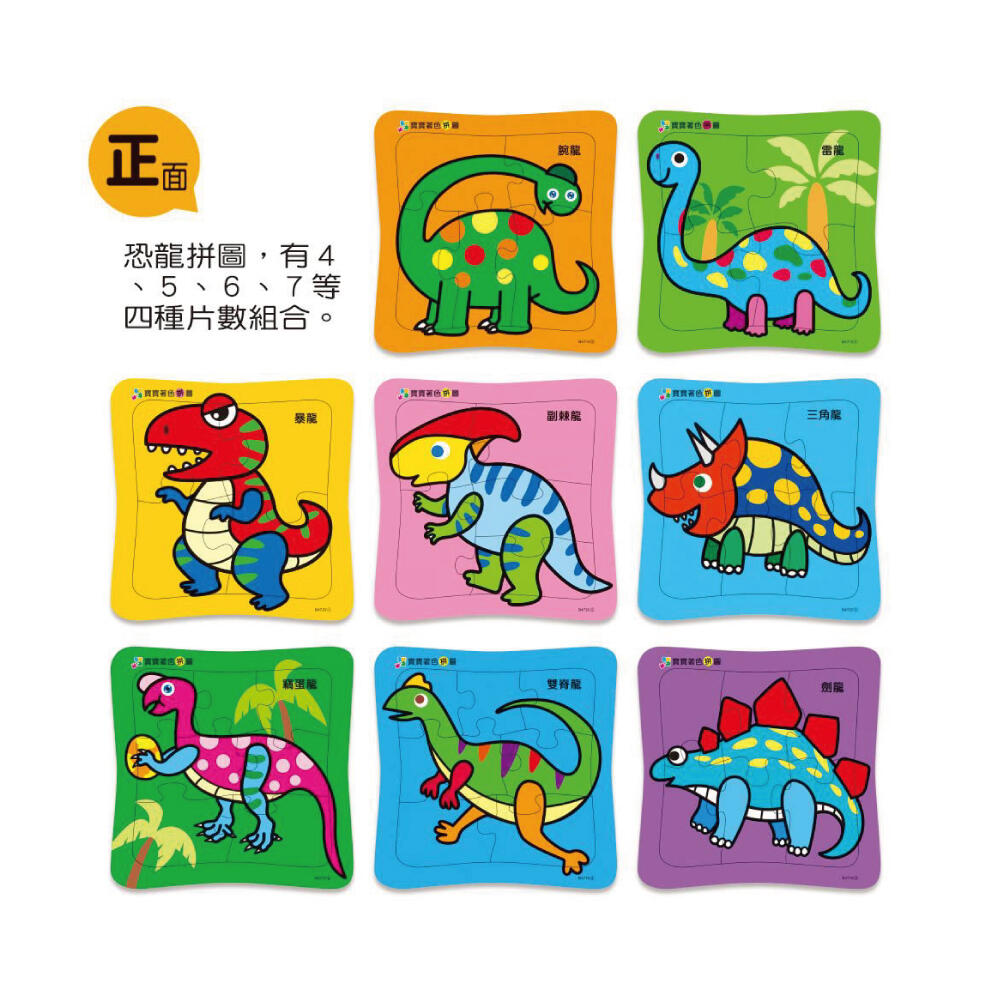 每盒內含八幅拼圖,正面是恐龍拼圖,四隻來自侏儸紀(腕龍、雷龍、劍龍、雙脊龍),另外四隻來自白堊紀(暴龍、三角龍、副棘龍、竊蛋龍),有4、5、6、7等四種片數組合。背面則是塗色遊戲,讓孩子愛上手繪。拼圖色彩鮮明,造型可愛,讓孩子從拼合的過程中了解部分與整體的概念,訓練手部小肌肉的發展,增進手眼協調、圖形辨識、邏輯思考等能力。