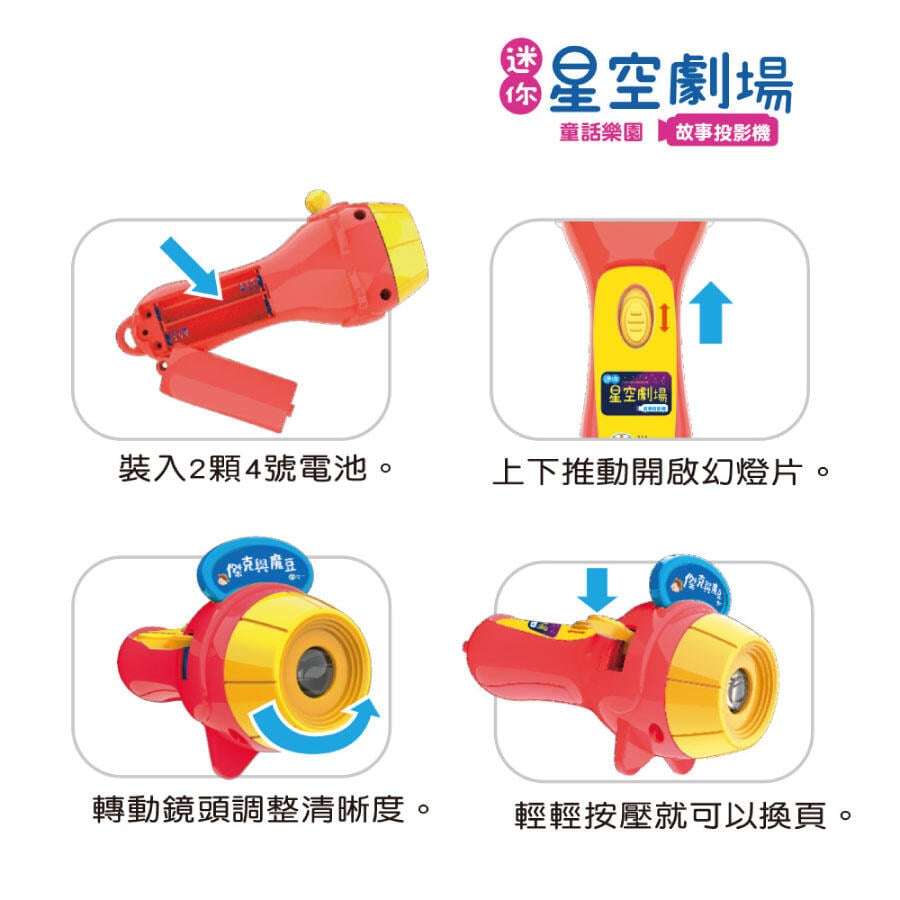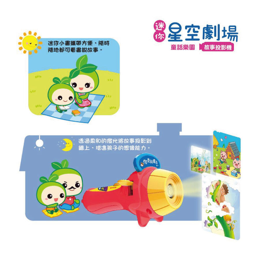本產品內含一支手電筒投影機、3片故事投影片以及3本故事厚紙小書。透過手電筒投影機就可以在牆上投射出故事畫面,或者可以和孩子一起躺在床上,將故事投射在天花板上,在輕鬆舒服的環境下更加投入故事情結。耳熟能詳的三則故事,讓爸爸媽媽能輕鬆的為孩子說故事。沒有文字的故事畫面,也可以讓孩子一邊看圖一邊自己說故事。