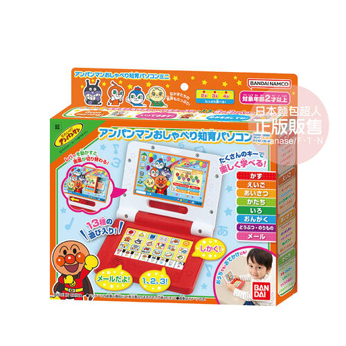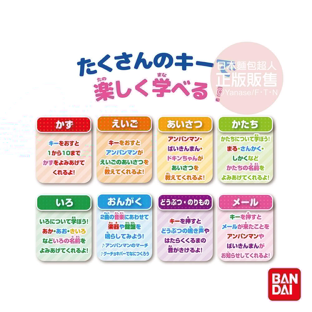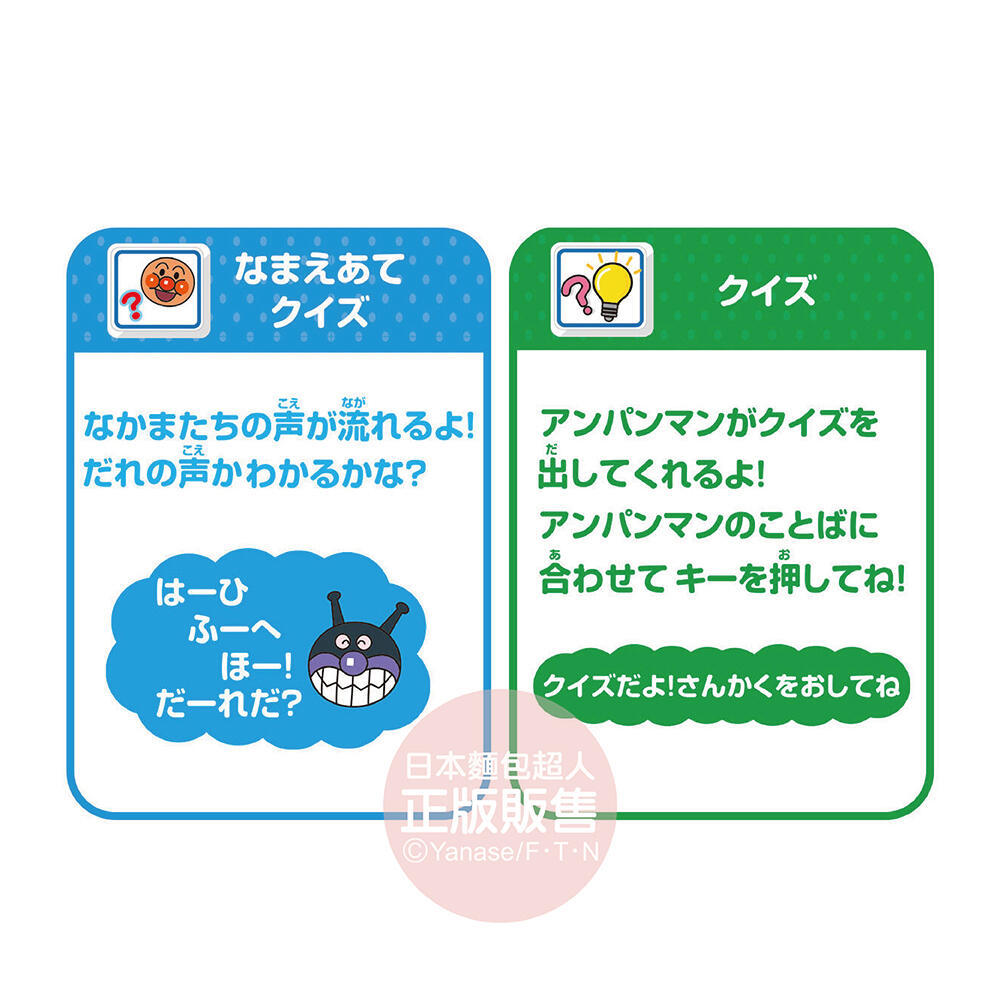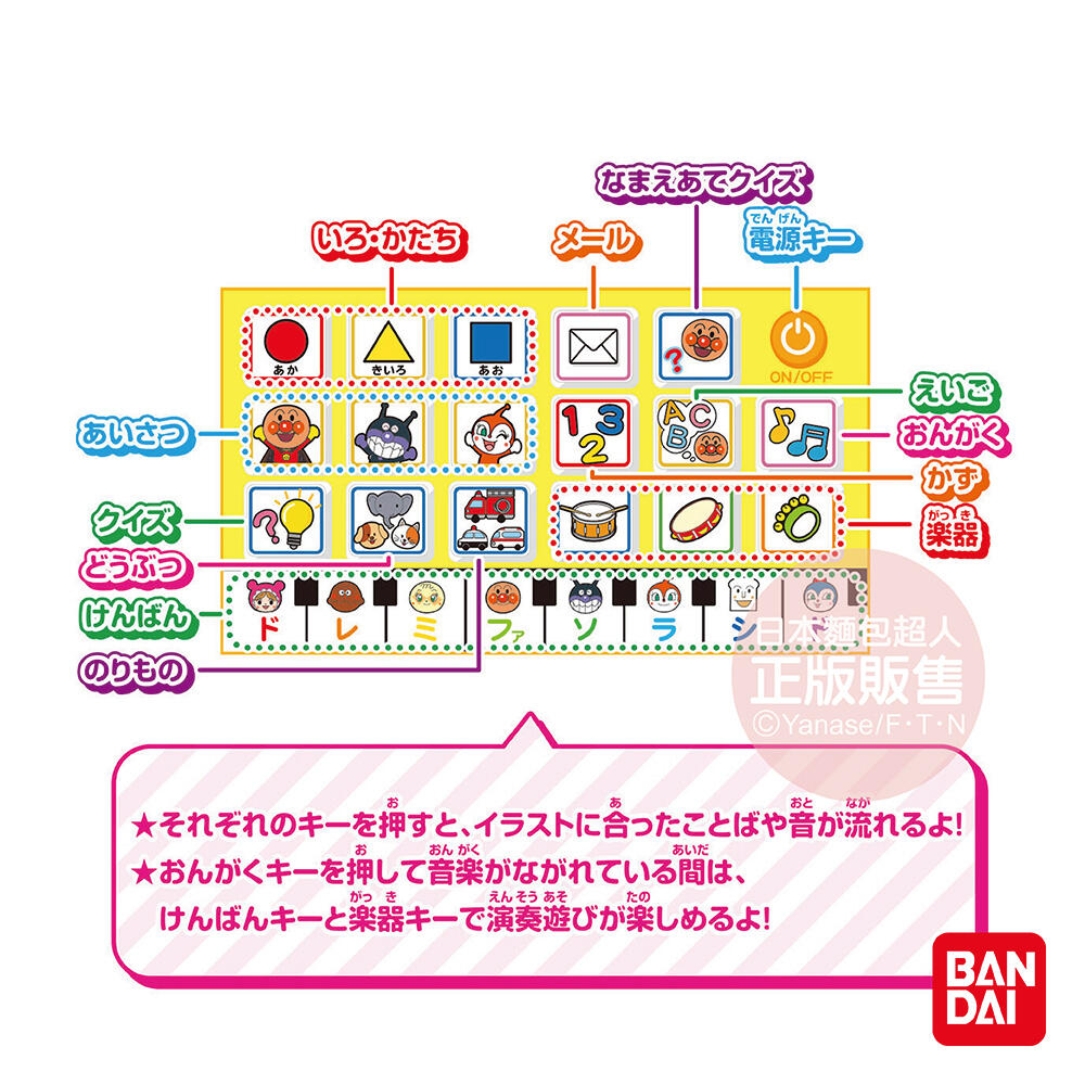 打開電源,按下按鍵,會發出不同的日語對話&音效,內含琴鍵&圖案按鍵,透過顏色&形狀、電子郵件遊戲、麵包超人人物角色聲音問答、打招呼、問答題、動物聲、交通工具聲、英語、音樂旋律、數字、琴鍵音階及樂器聲等多種學習玩法,豐富又好玩,邊玩邊學習。滑動螢幕上的紅色鈕,畫面也能改變喔!孩子好開心!小型機身,輕巧方便攜帶,隨時隨地都能玩喔! ※本產品使用2顆4號電池(另購)