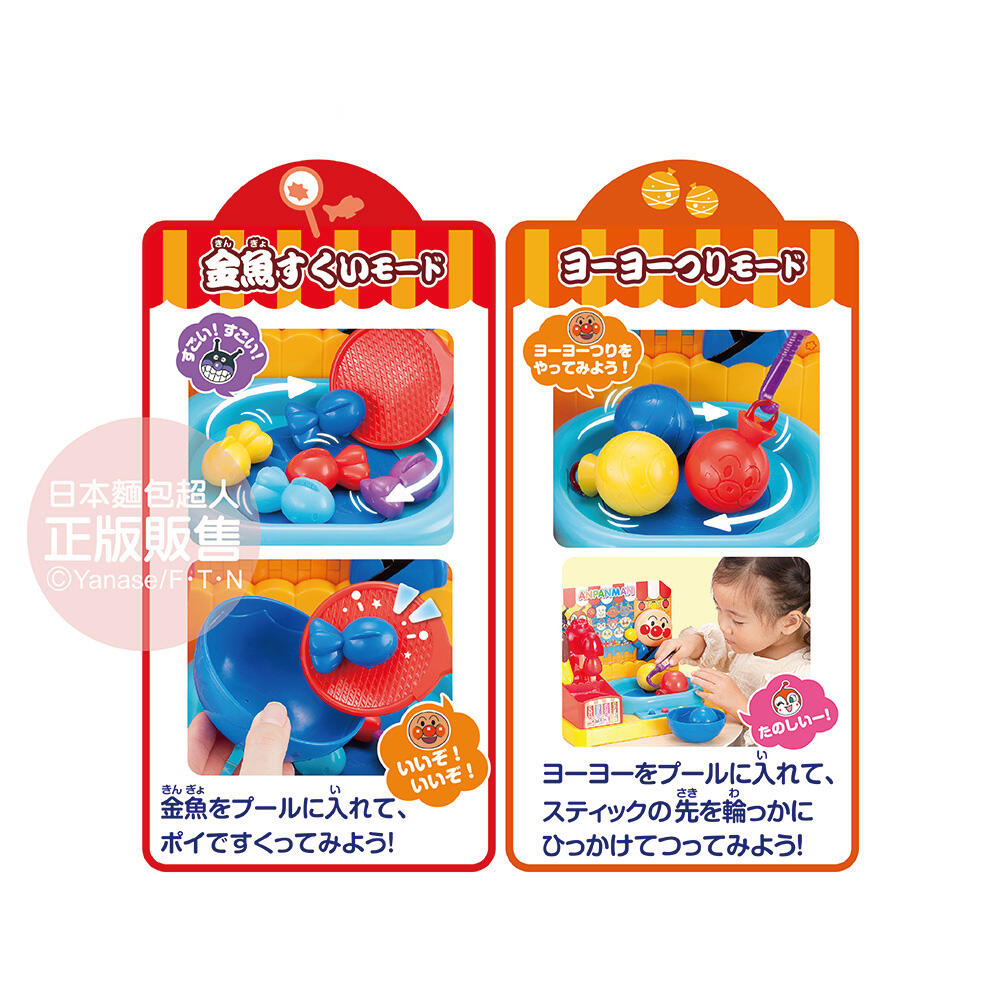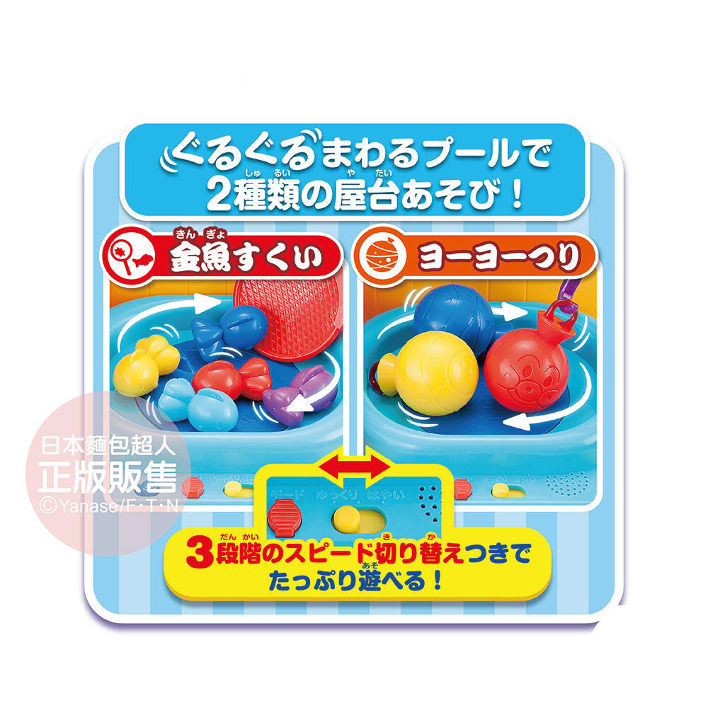 1.撈金魚模式:將金魚放入旋轉池內,試看看撈金魚吧!還會發出「麵包超人」及「細菌人」的日語對話喔!