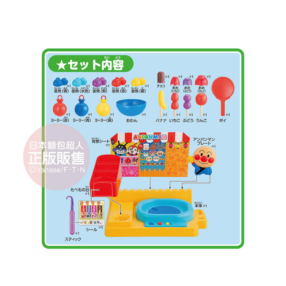 組合內容:金魚(藍)*1;金魚(水藍)*1;金魚(紫)*1;金魚(紅)*1;金魚(黃)*1;水球(紅)*1;水球(藍)*1;水球(黃)*1;碗*1;巧克力*1;香蕉*1;糖衣(草莓)*1;草莓*1;糖衣(葡萄)*1;葡萄*1;糖衣(蘋果)*1;蘋果*1;撈魚具*1;背景版*1;麵包超人招牌*1;小吃台面*1;本體*1;釣竿*1;貼紙*1。