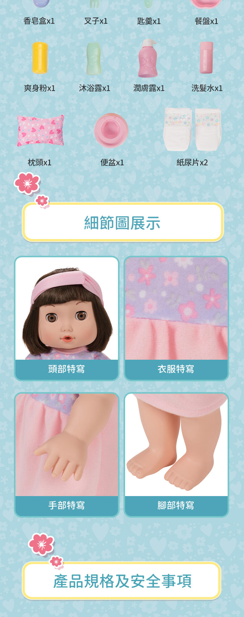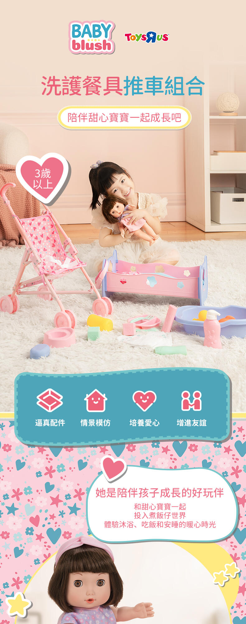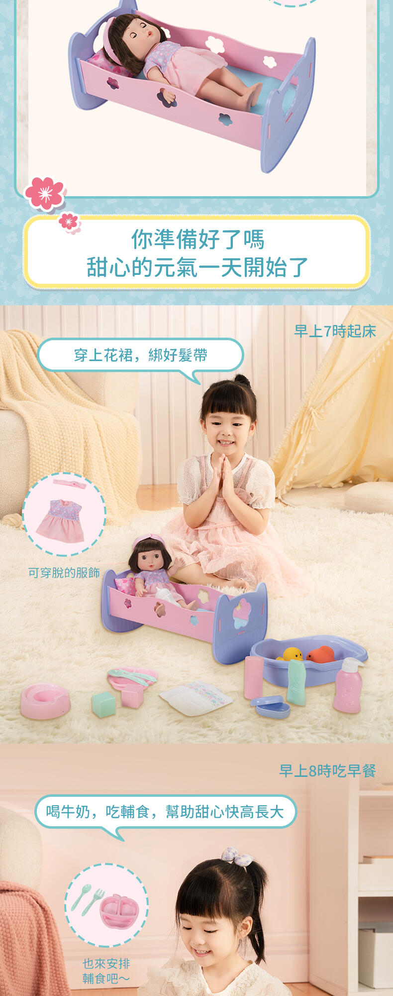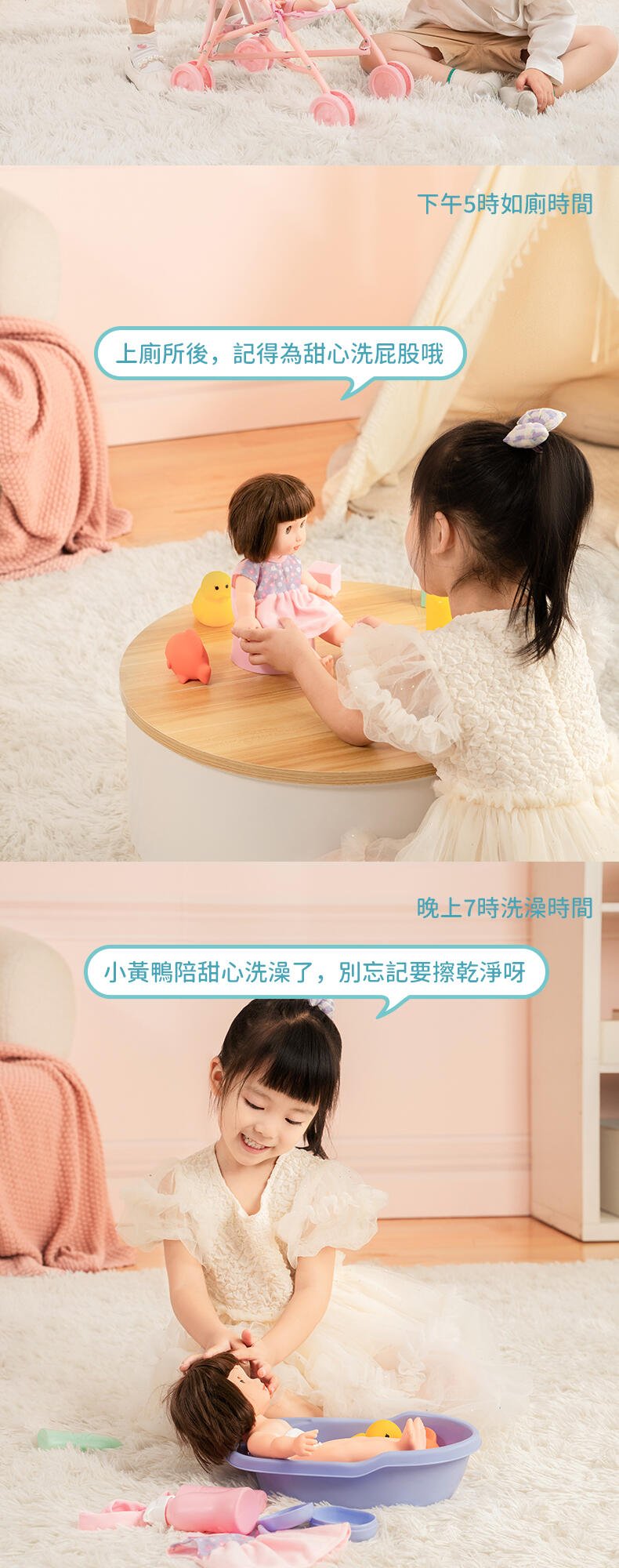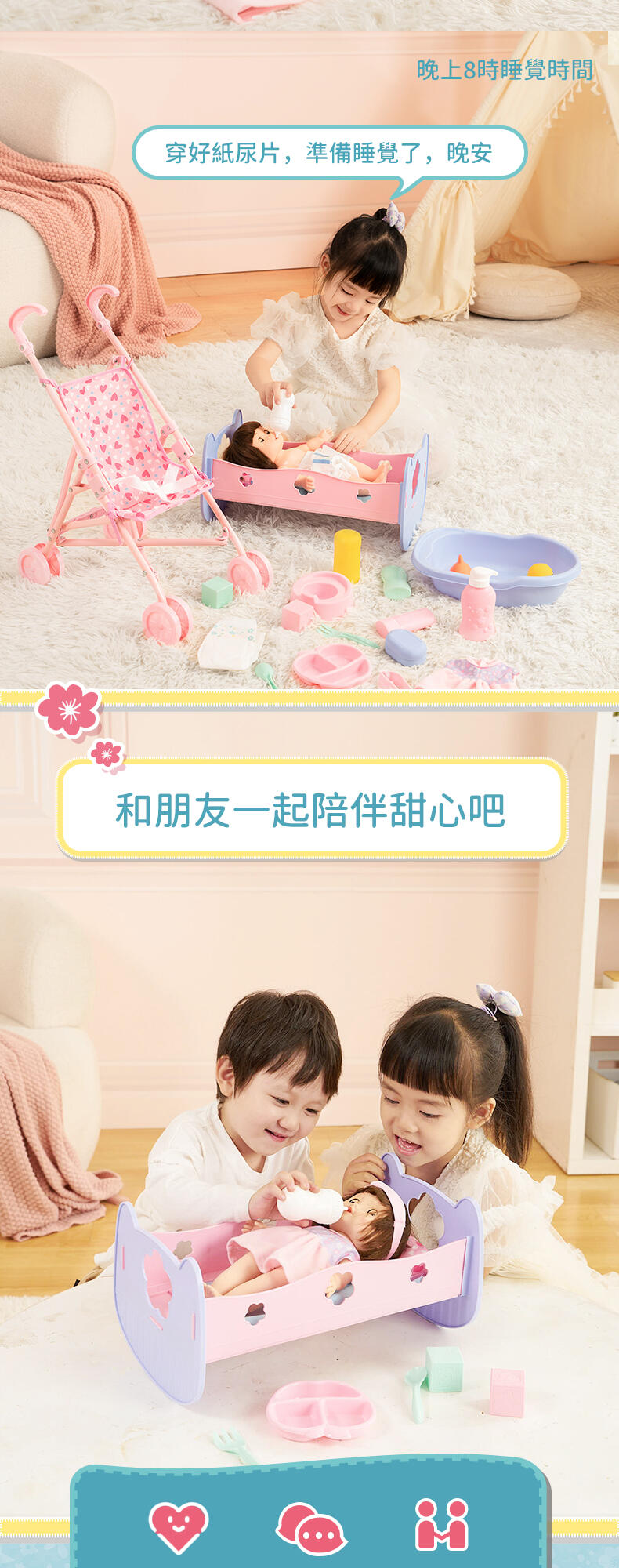 這款終極多合一套裝包含照顧甜心嬰兒玩偶的一切所需。為她洗澡,餵她進食,並協助她使用小坐廁。外出旅行時,用她自己的嬰兒車帶她旅行。甜心的尺寸經細心設計,切合小孩子雙手的大小,小孩子容易為她洗澡、更衣,與她擁抱及愛護她。