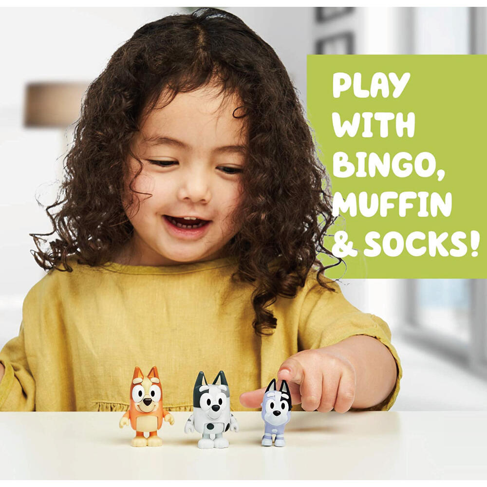 - 在這個包裝中,您會發現 Bluey's sister Bingo 和 2 個表兄弟 - 馬芬和襪子