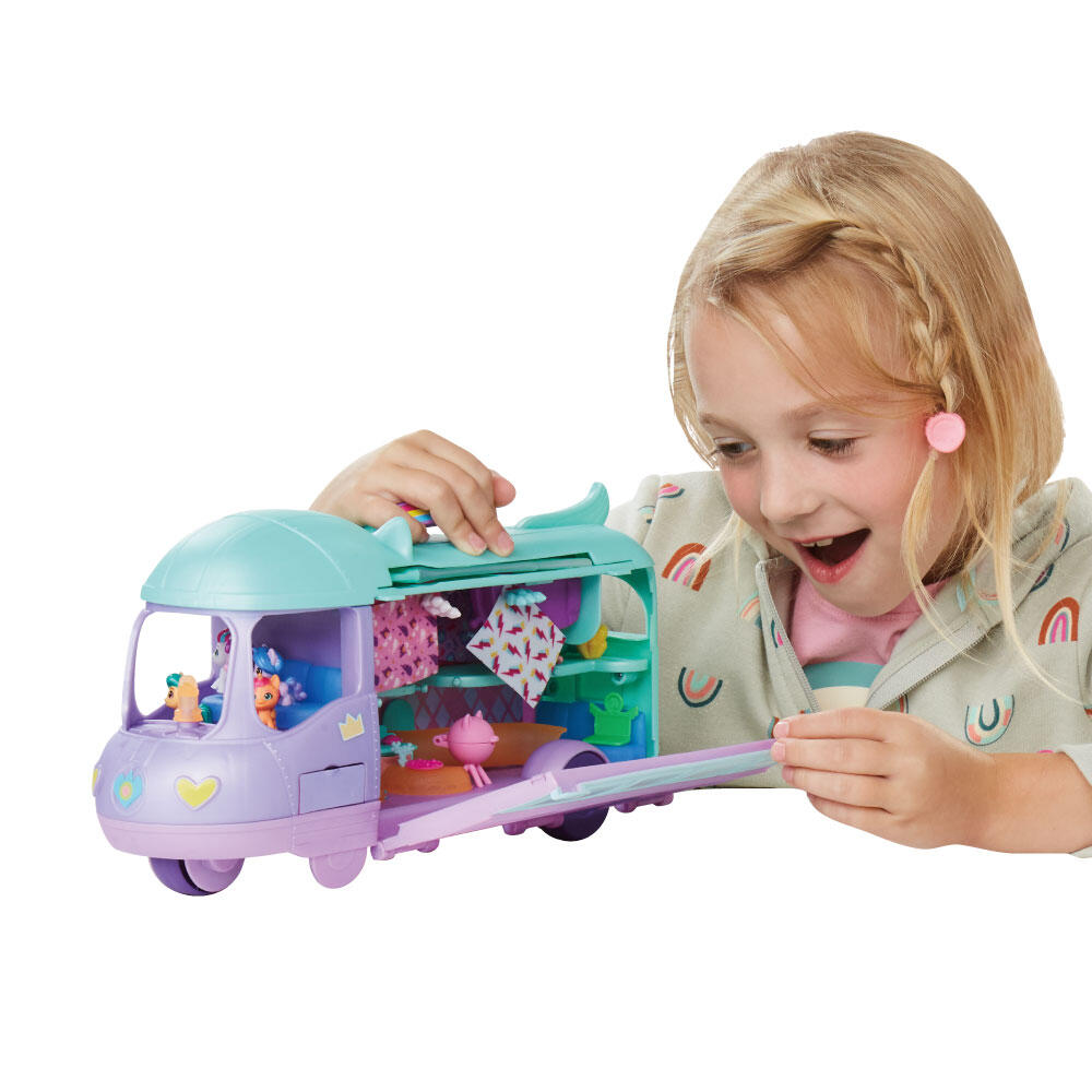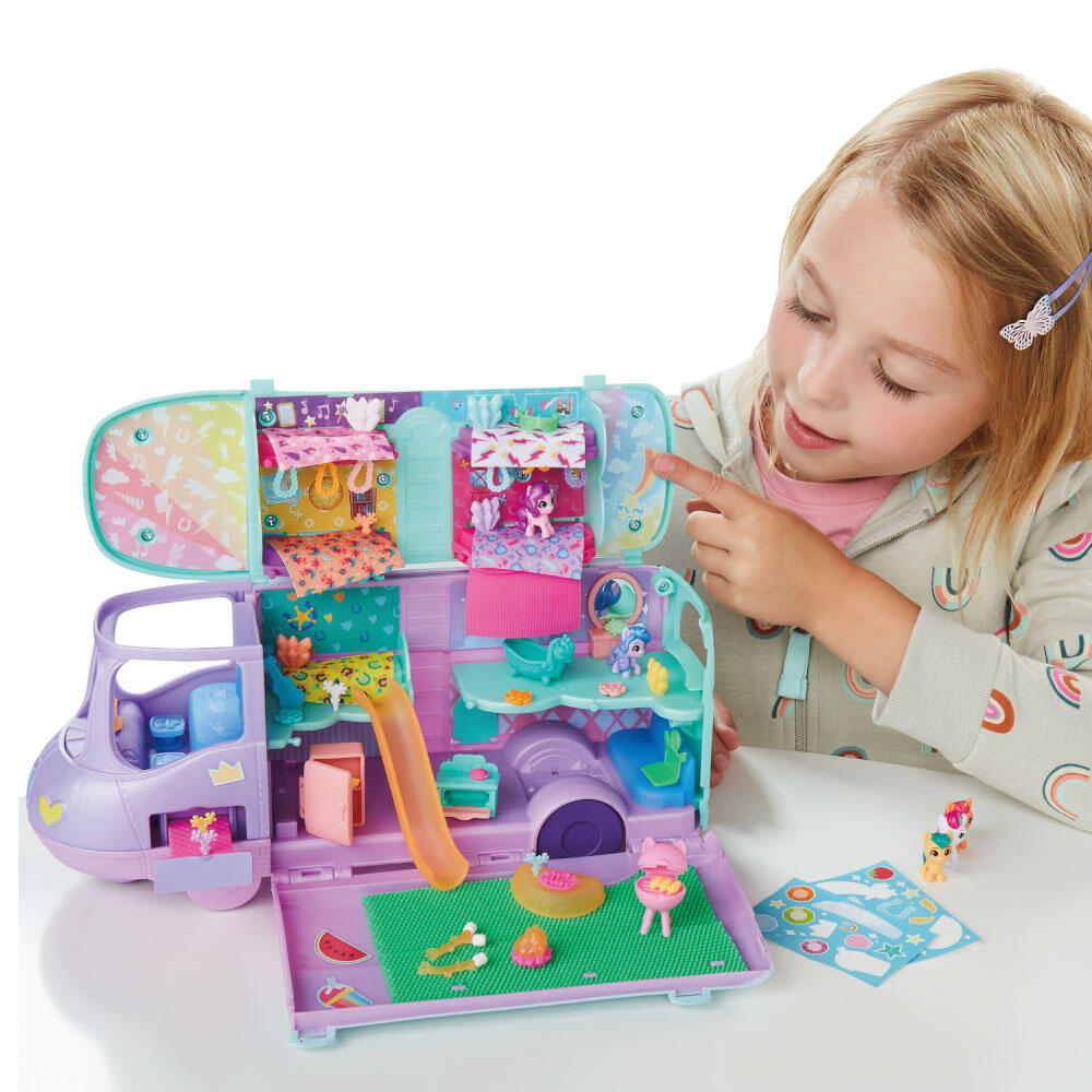 - 附車輪和雙翼的遊戲組:這款露營車遊戲組可以收納《彩虹小馬》玩偶與配件,它的車輪可以轉動,還可以張開翅膀。 這款遊戲組是適合送給女孩和男孩們的趣味驚喜遊戲!