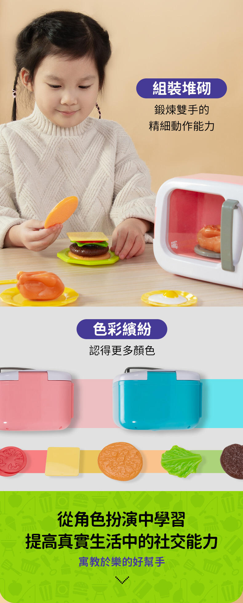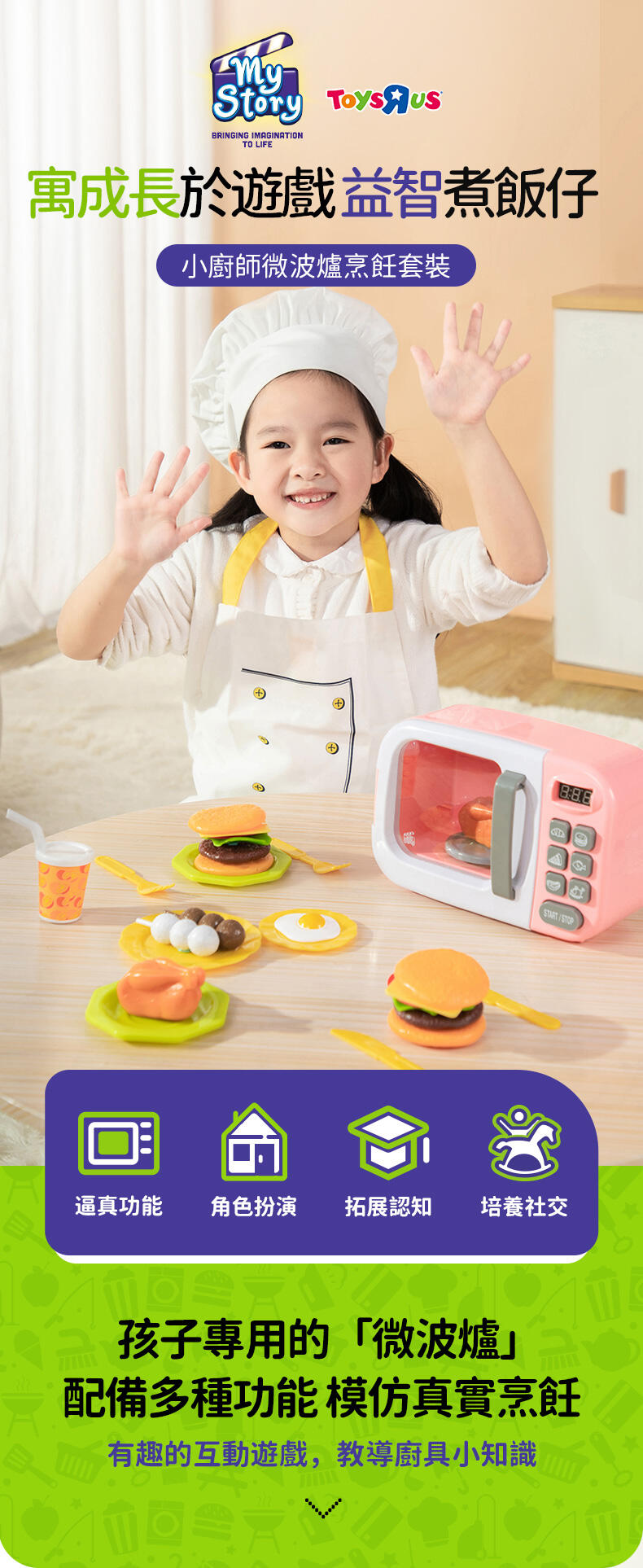 這款迷你微波爐的燈效和聲效幾可亂真,不單設有可按動的按鈕和可旋轉的轉盤,更會在烹調食物時亮燈,與真正的微波爐一模一樣!孩子可以使用本產品的食物和用具配件,為家人朋友製作和料理美味的食物,塑造真實的遊戲體驗。微波爐的互動和逼真功能可為孩子帶來愉快的開放式體驗,在遊戲的過程中幫助他們建立自信。