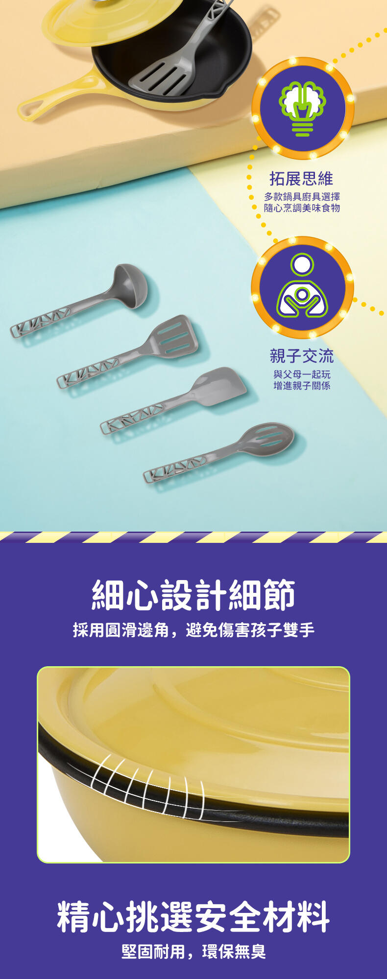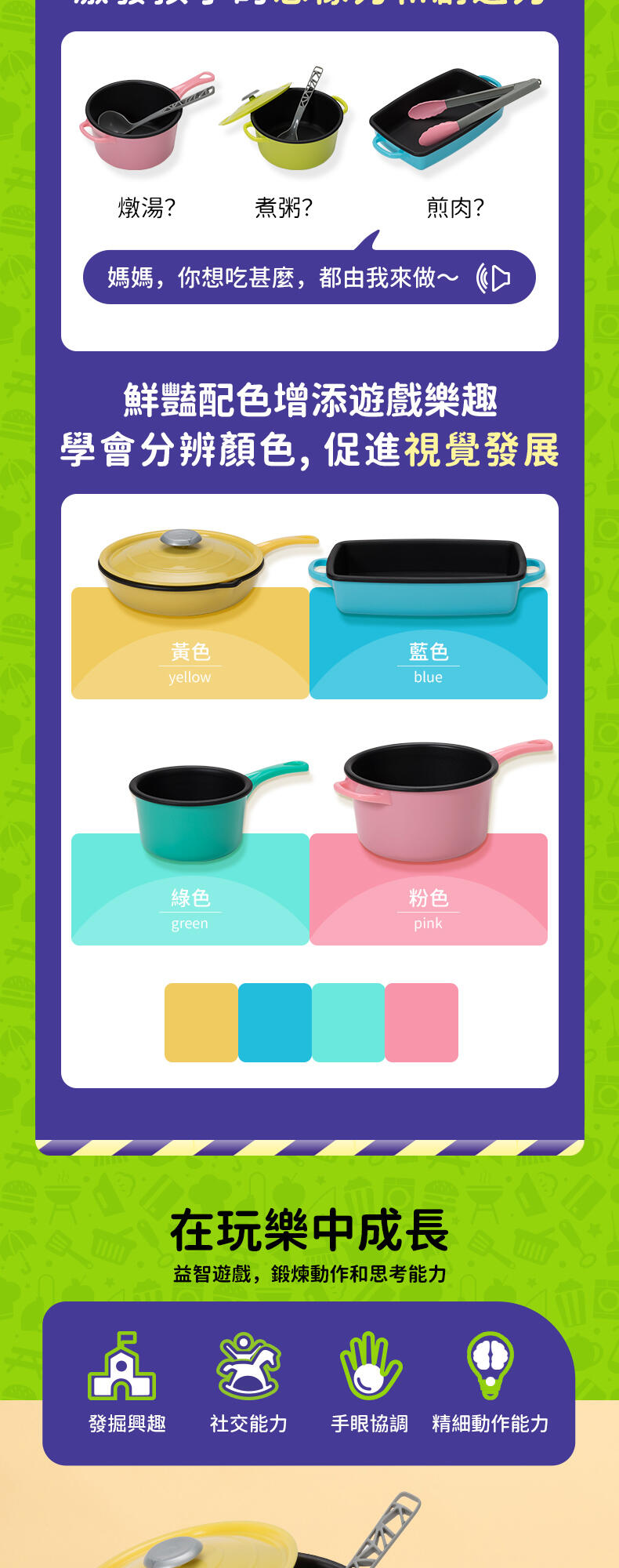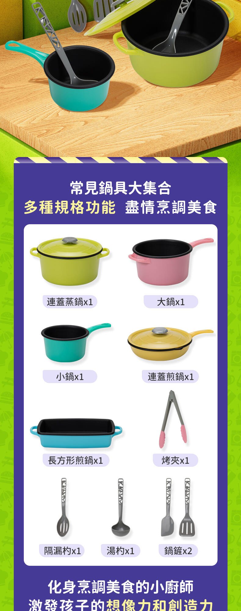這款鼓舞人心的廚具套裝包含所有必備品,可讓初出茅廬的廚師和家庭廚師測試他們的技能並發揮他們的想像力!孩子們會喜歡有機會經營自己的廚房或家庭,為朋友、父母和兄弟姐妹做飯。鼓勵小孩子通過角色扮演和講故事來測試他們的創造力,設定他們自己的遊戲議程,並使用每個組件作為道具來進一步敘述或遊戲。每件商品均採用安全、耐用且無毒的材料製成,讓您高枕無憂。