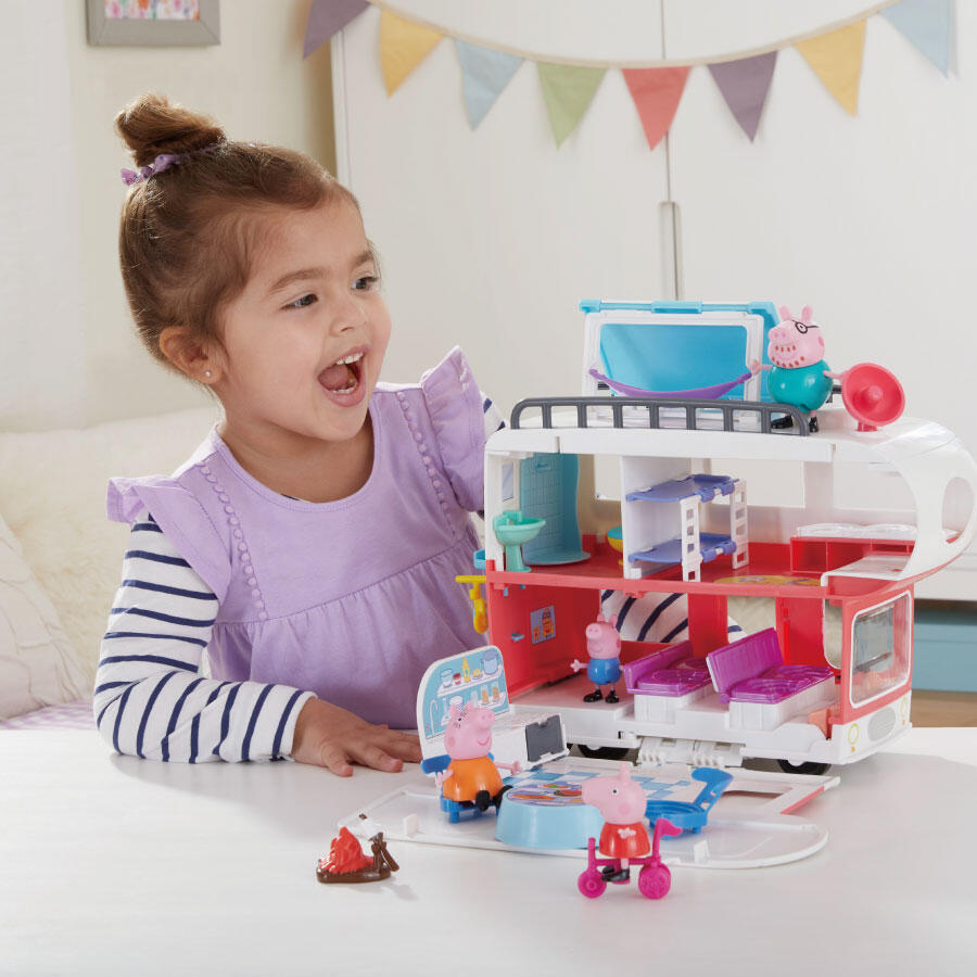 粉紅豬小妹豪華露營車遊戲組讓孩子們想像與佩佩和她的家人一起度假! 車輛可轉換為多層RV場景,進行令人興奮旅行冒險