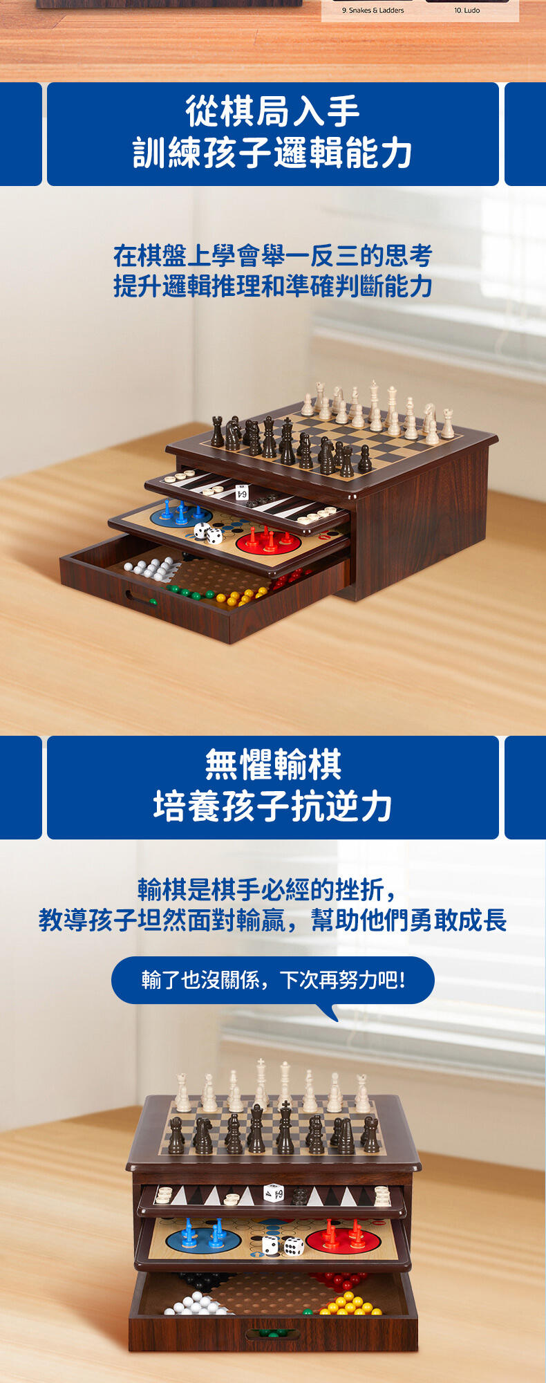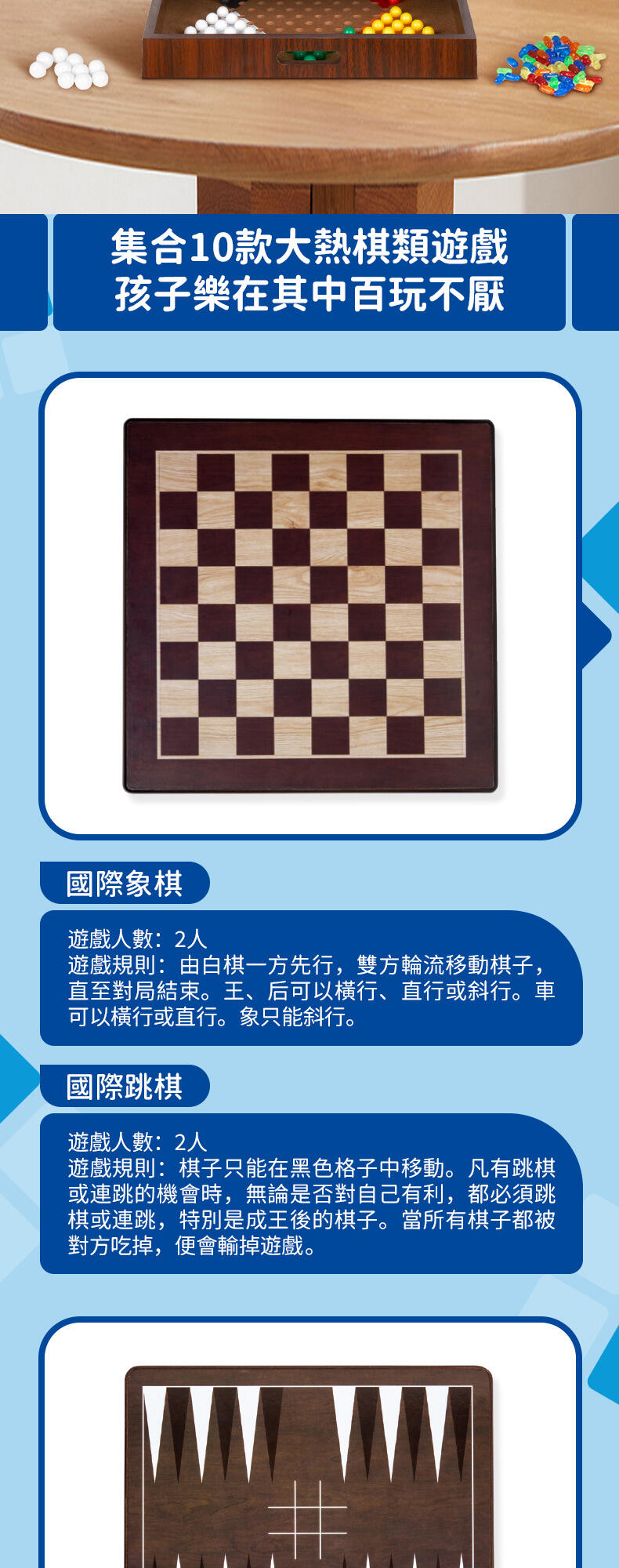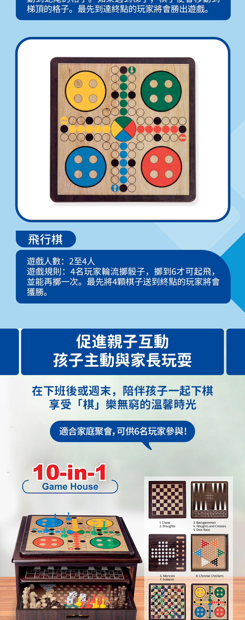 這款遊戲套裝包括跳棋、雙陸棋、播棋、過三關、中國跳棋、蛇梯棋、十字棋、孔明棋及骰子競賽,可謂一應俱全,適合一家大小和任何場合。