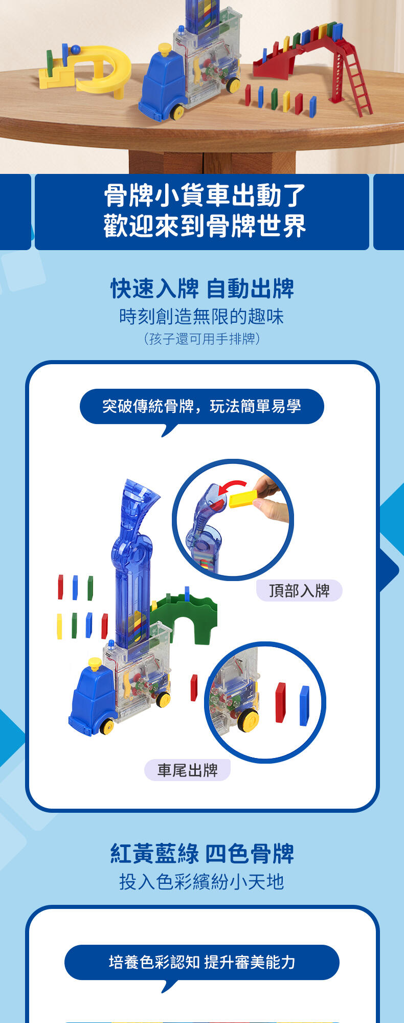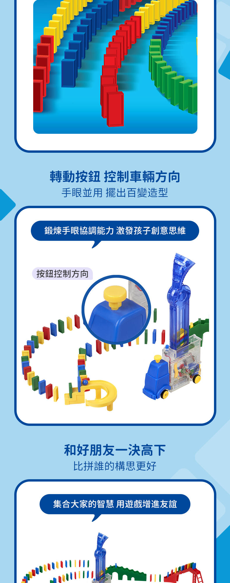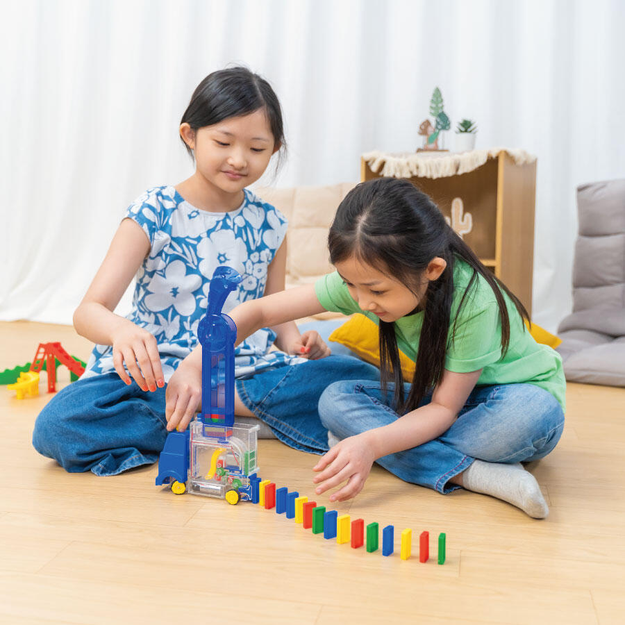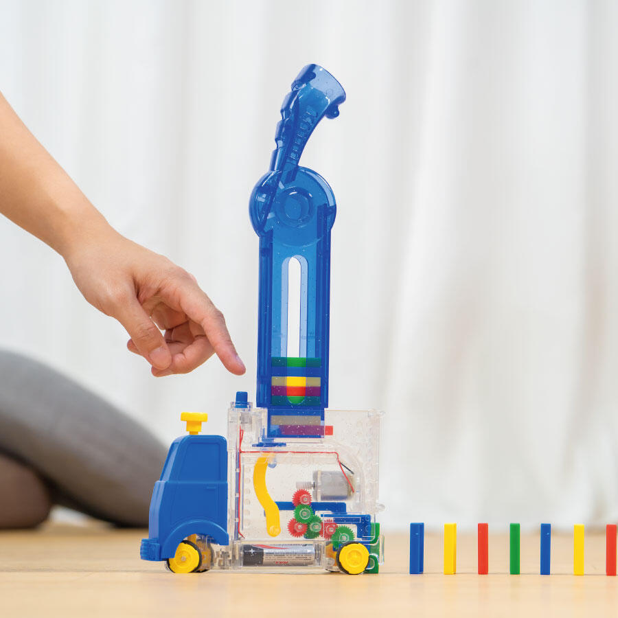 這款特別設計的自動建築車可以建立玩家專屬的骨牌王國。只要將骨牌逐一放入,小貨車便會自動將骨牌排成完美的曲線或直線。快來發揮創意,用數以百計的骨牌建立七彩王國。