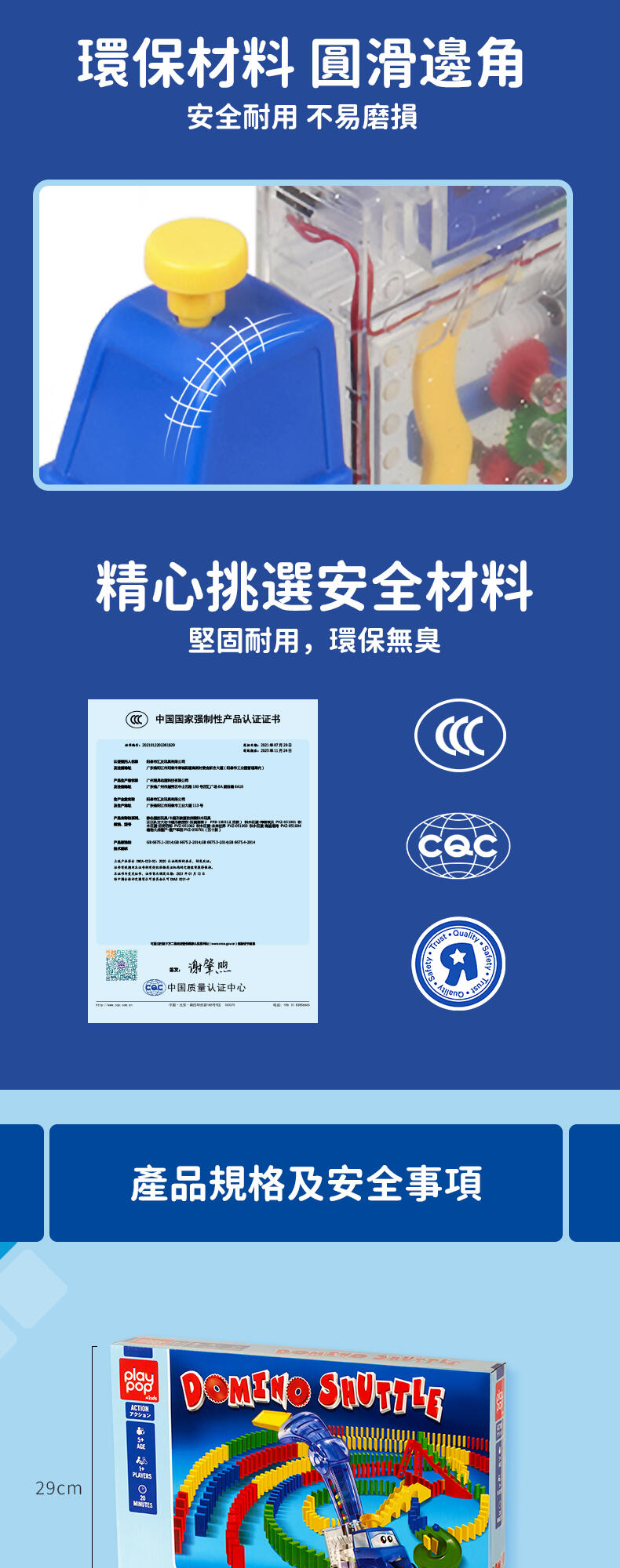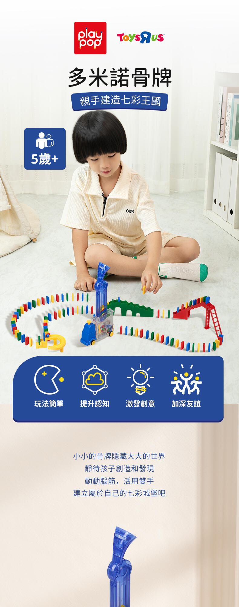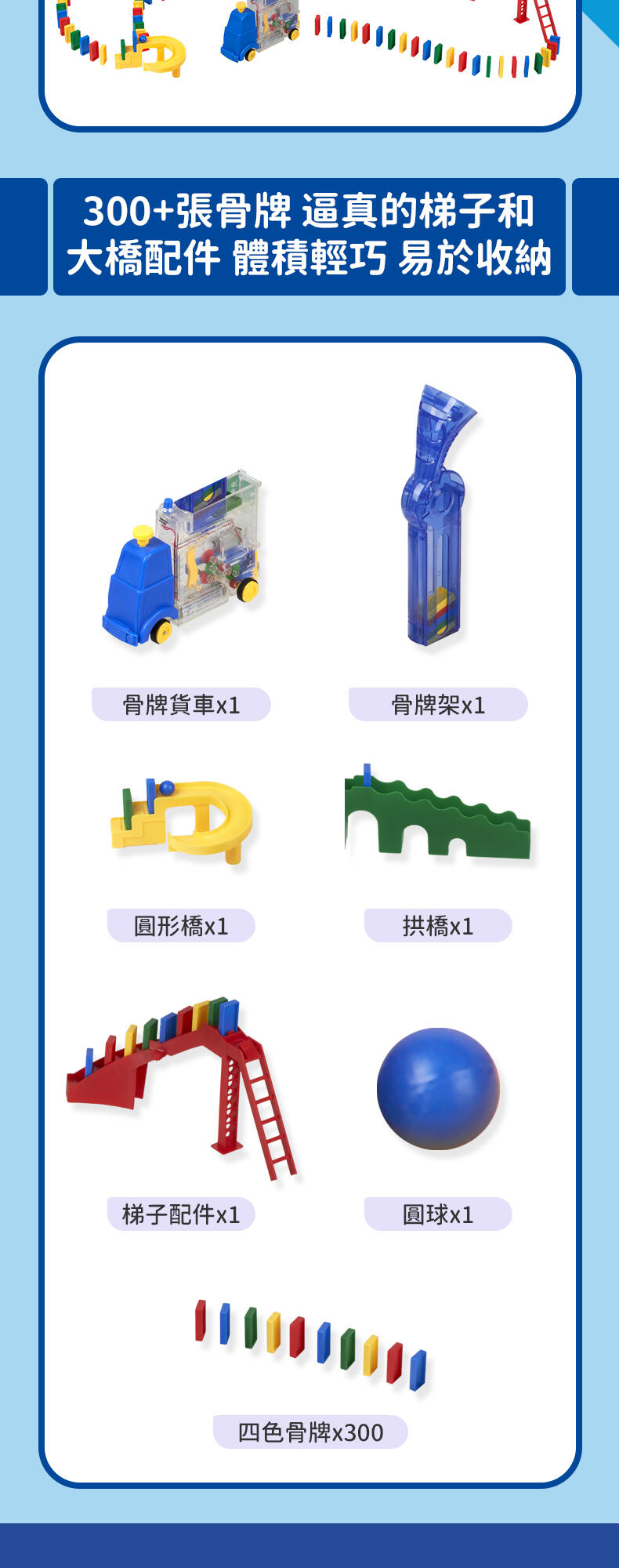 這款特別設計的自動建築車可以建立玩家專屬的骨牌王國。只要將骨牌逐一放入,小貨車便會自動將骨牌排成完美的曲線或直線。快來發揮創意,用數以百計的骨牌建立七彩王國。