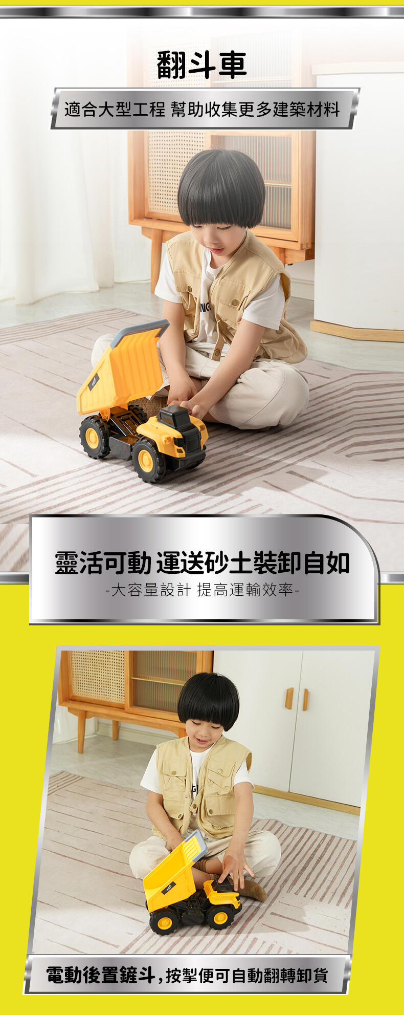 這款電動砂石車可讓小小建築師熟悉工地的環境。工程車結實堅固,車尾的電動鏟斗可以升高下降,而且孩子只需按下按鈕,便能控制車子前後移動!運泥車的輪子用料厚實,並可自由移動,孩子能邊推邊玩,同時發展必要的認知和社交技能。這款特別的產品適合送給摯愛,更能與其他玩具組合,讓孩子在充滿創意的遊戲中獲得無窮滿足感。