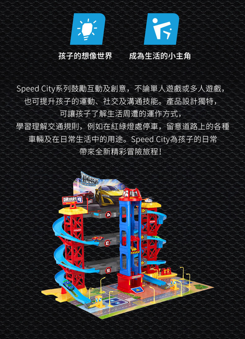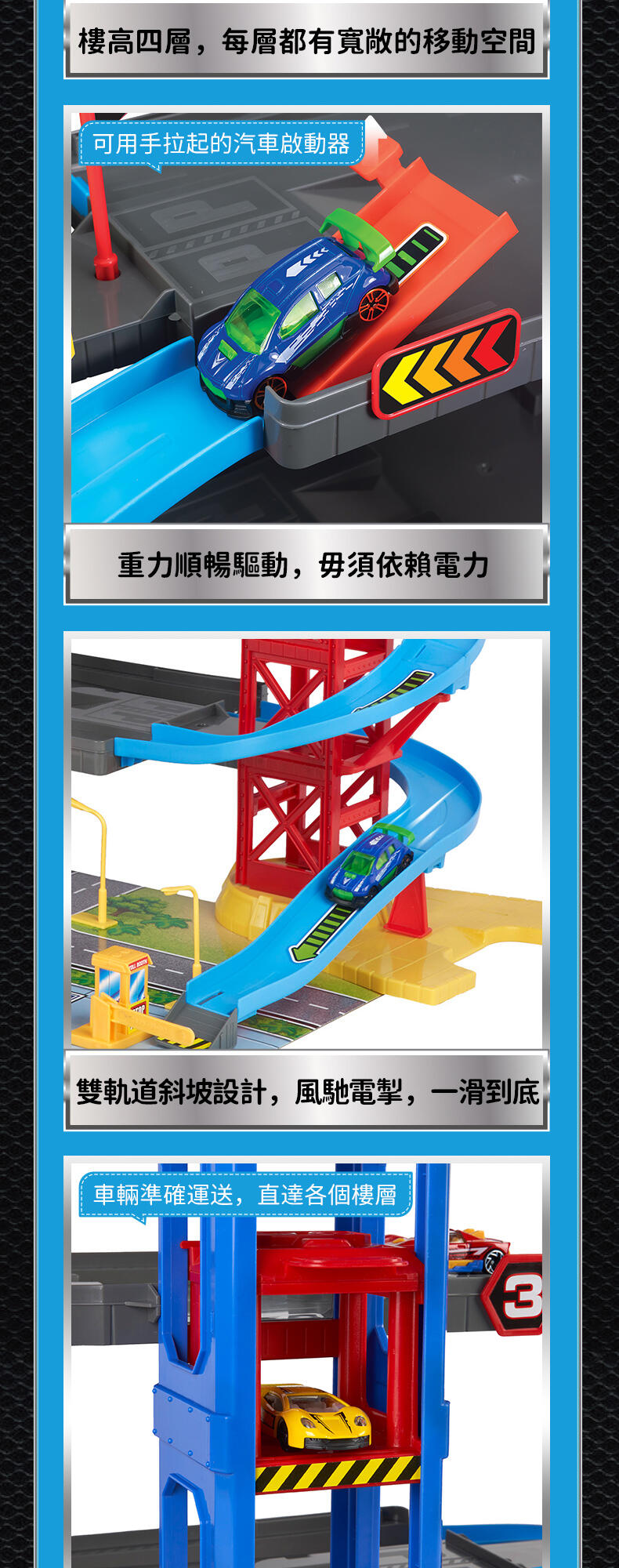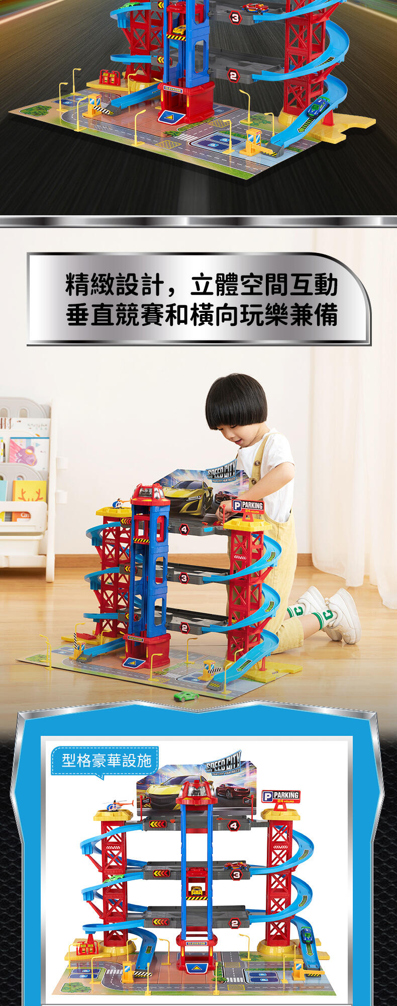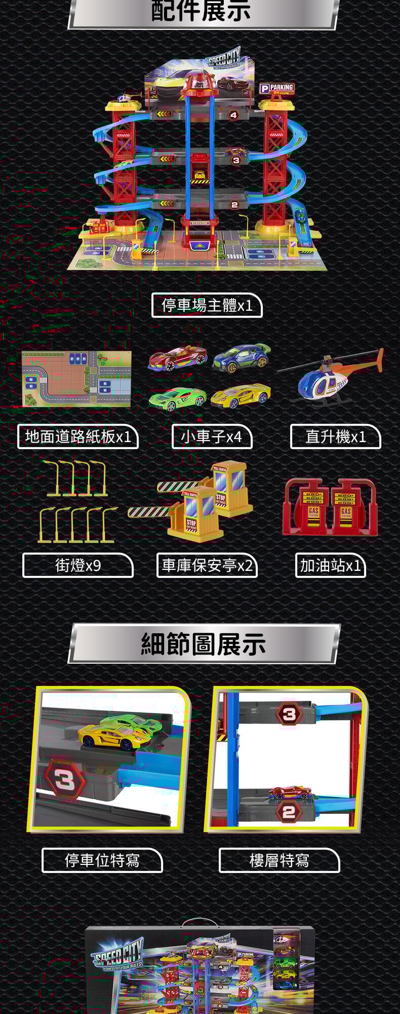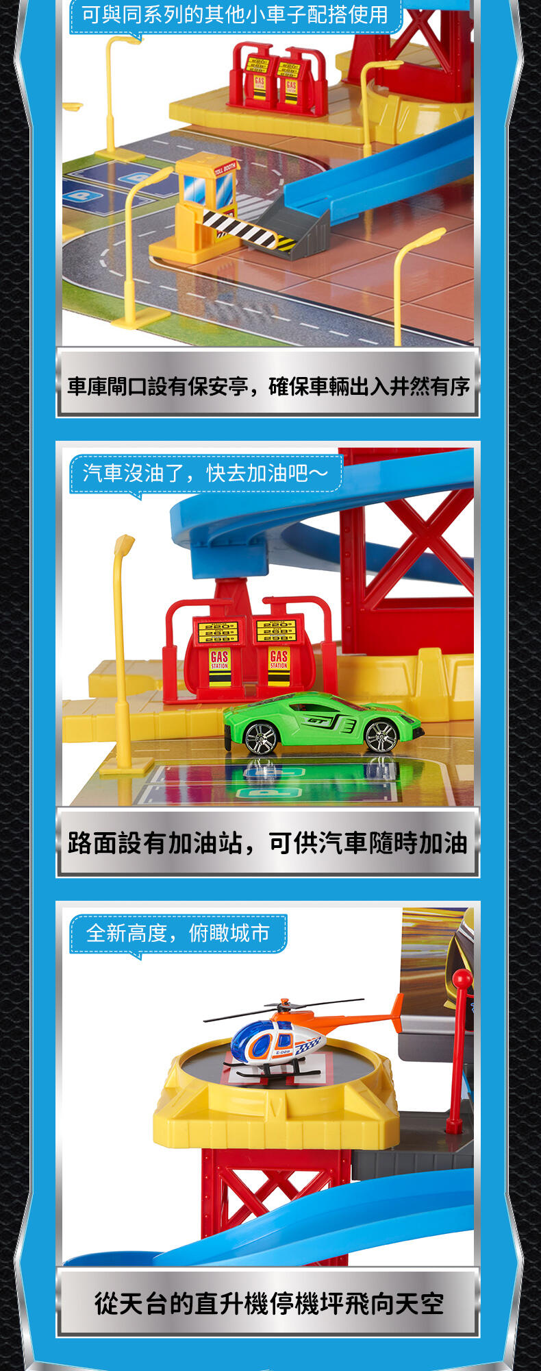 超級城市車庫是所有跑車和汽車的集中地。車庫共分4層,你可以在廣闊的空間操作可動的車用升降機、汽車啟動設施和5部壓鑄車。你也可以駕駛直升機從天台的停機坪著陸區升空,飽覽城市美景。這款套裝包羅萬有,讓你體驗城市的最繁忙一面。